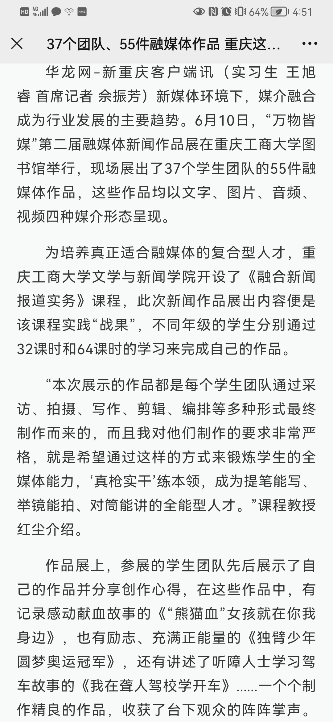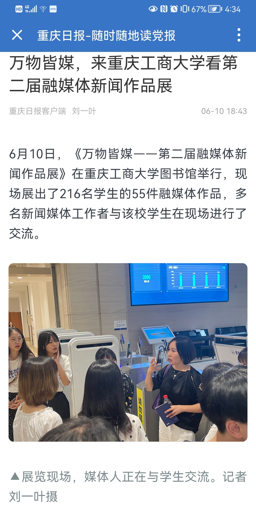 近日,重庆日报、新华网重庆频道等近10家媒体报道pp电子文学与新闻学院万物皆媒·第二届融媒体新闻作品展。6月10日,重庆日报以“万物皆媒,来pp电子平台官网入口看第二届融媒体新闻作品展”为题报道pp电子文学与新闻学院万物皆媒·第二届融媒体新闻作品展。华龙网-新重庆客户端以“37个团队、55件融媒体作品 重庆这所高校让学生“真枪实干”练本领”为题报道pp电子文学与新闻学院万物皆媒·第二届融媒体新闻作品展。新华网以“实战实干练全媒体技能,pp电子平台官网入口展出55件融媒体作品”为题报道pp电子文学与新闻学院万物皆媒·第二届融媒体新闻作品展。上游新闻以“万物互媒—第二届融媒体新闻作品展,55件作品展示当代大学生创作实力”为题报道pp电子文学与新闻学院万物皆媒·第二届融媒体新闻作品展。今日头条、网易、澎湃新闻、新浪新闻等媒体以“实战实干练全媒体技能,pp电子平台官网入口展出55件融媒体作品”为题进行转载报道。