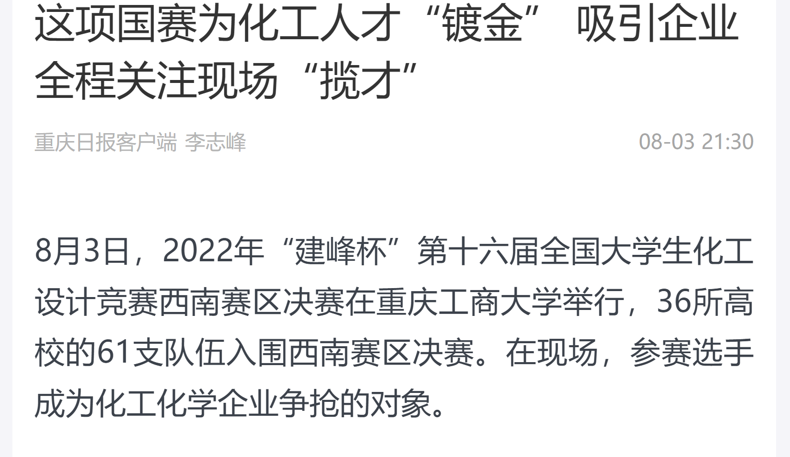 重庆日报报道pp电子承办2022年“建峰杯”第十六届全国大学生化工设计竞赛西南赛区决赛