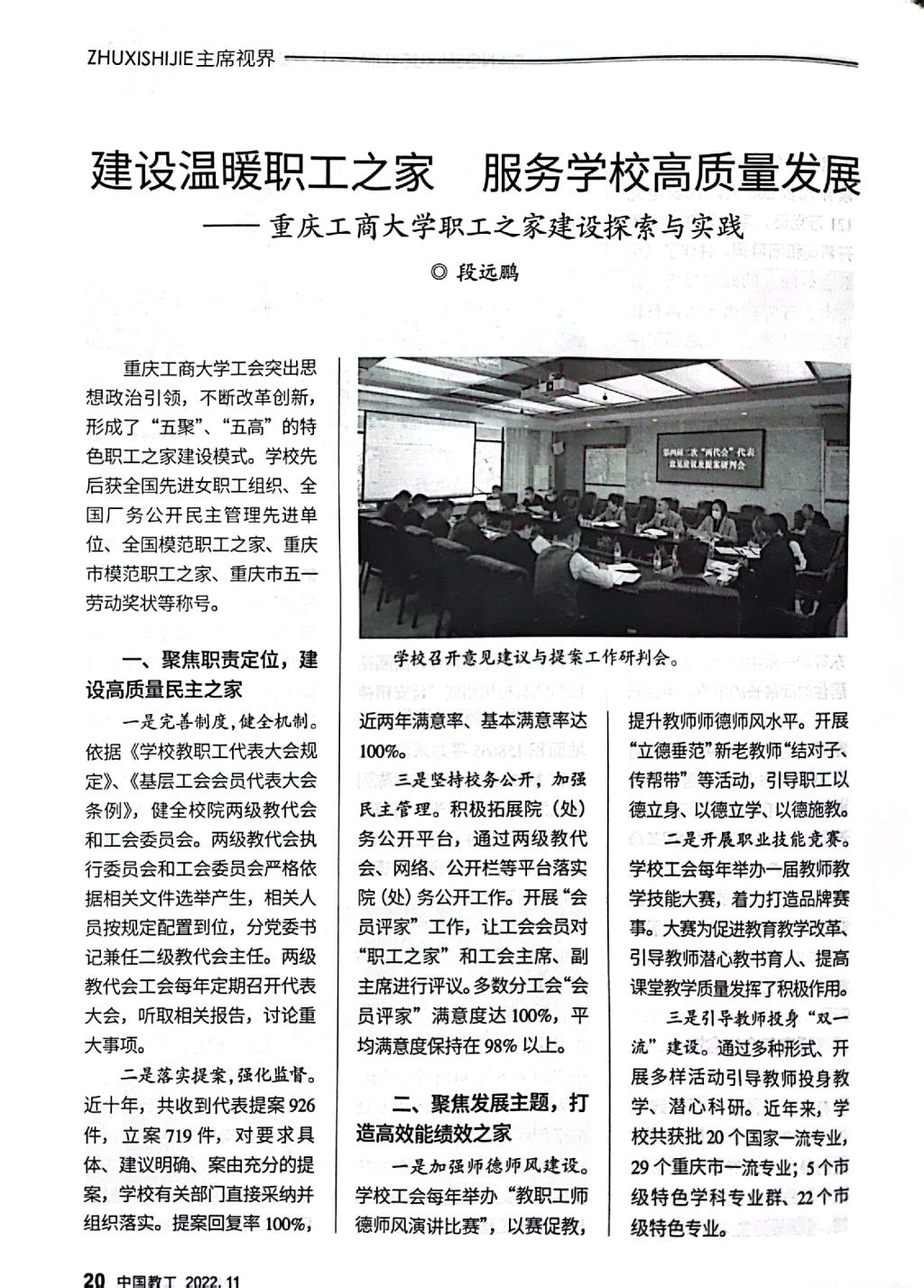 《中国教工》是中华全国总工会主管的中国教科文卫体工会会刊,该刊2022年第11期刊发了pp电子工会以《建设温暖职工之家,服务学校高质量发展——pp电子平台官网入口职工之家建设探索与实践》为题的职工之家建设经验文章。文章专题介绍pp电子工会坚持党建带工建,突出思想政治引领,以“安康之家”“文明之家”建设为基础,不断改革创新,形成了聚焦政治责任,建设高质量民主之家;聚焦发展主题,打造高效能绩效之家;聚焦“急难愁盼”,建设高品质温暖之家;聚焦特色活动,建设高标准品牌之家;聚焦改革创新,建设高水平职工之家的“五聚”“五高”特色职工之家建设模式。