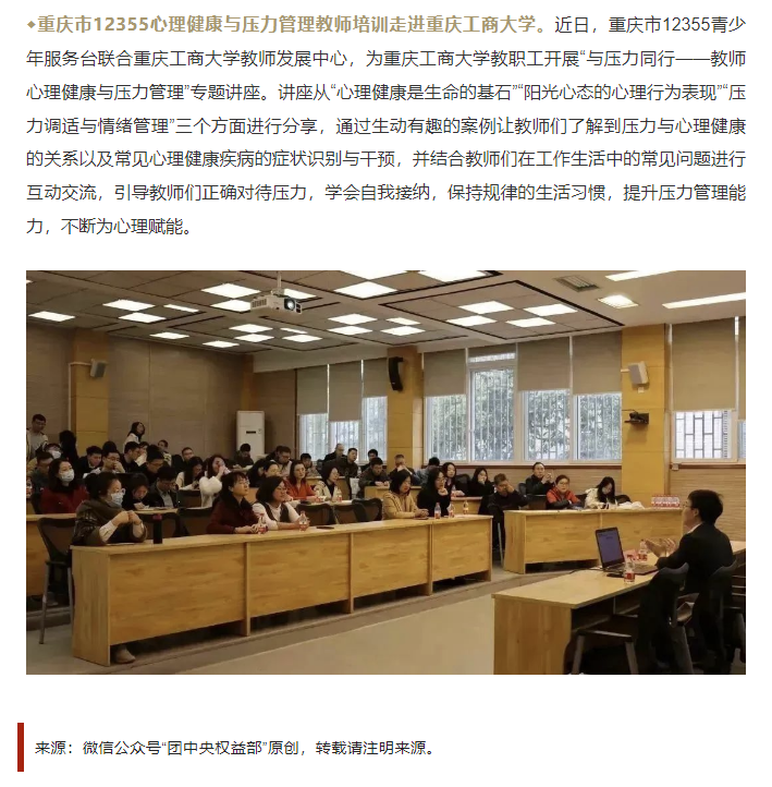为帮助pp电子教师提高心理素质和心理调适能力,3月17日上午,教师发展中心联合重庆市12355青少年服务台、重庆市青春导航青少年发展服务中心,特邀重庆市委党校心理学教师、教育部“国培计划”授课专家唐溢,为pp电子教职工开展“与压力同行—教师心理健康与压力管理”专题讲座。团中央权益部微信公众号对活动进行了宣传报道。