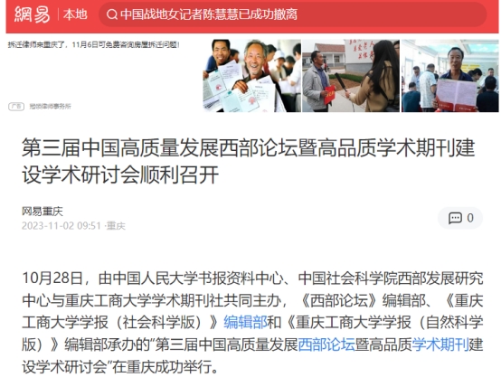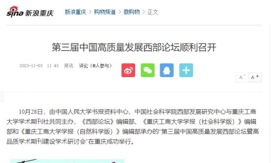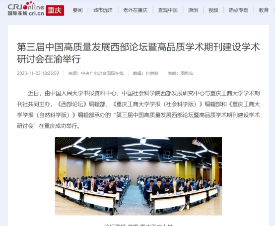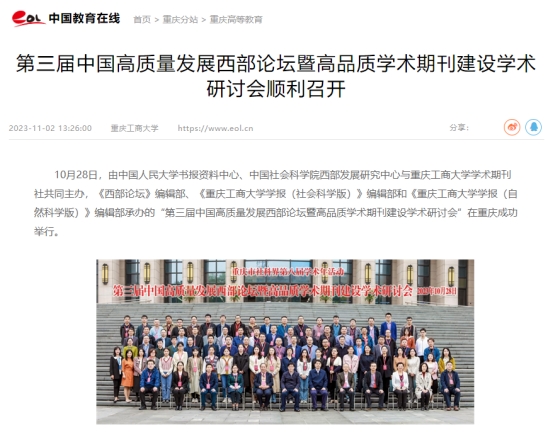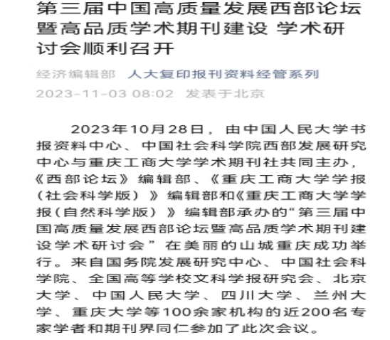 近日,由pp电子学术期刊社与中国人民大学书报资料中心、中国社会科学院西部发展研究中心联合主办的“第三届中国高质量发展西部论坛暨高品质学术期刊建设学术研讨会”成功召开。中央广电总台国际在线以《第三届中国高质量发展西部论坛暨高品质学术期刊建设学术研讨会在渝举行》为题,新华网以《第三届中国高质量发展西部论坛暨高品质学术期刊建设学术研讨会顺利召开》为题,环球网以《第三届中国高质量发展西部论坛在重庆召开》为题,新浪网以《第三届中国高质量发展西部论坛顺利召开》为题,网易新闻以《第三届中国高质量发展西部论坛暨高品质学术期刊建设学术研讨会顺利召开》为题,中国教育在线以《第三届中国高质量发展西部论坛暨高品质学术期刊建设学术研讨会顺利召开》为题,予以广泛报道。另外,中国人民大学书报资料中心以《第三届中国高质量发展西部论坛暨高品质学术期刊建设学术研讨会顺利召开》为题进行了公开报道。