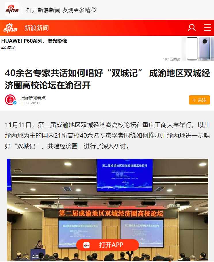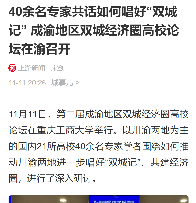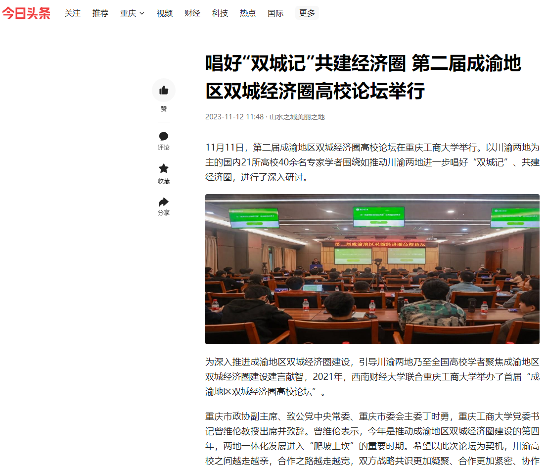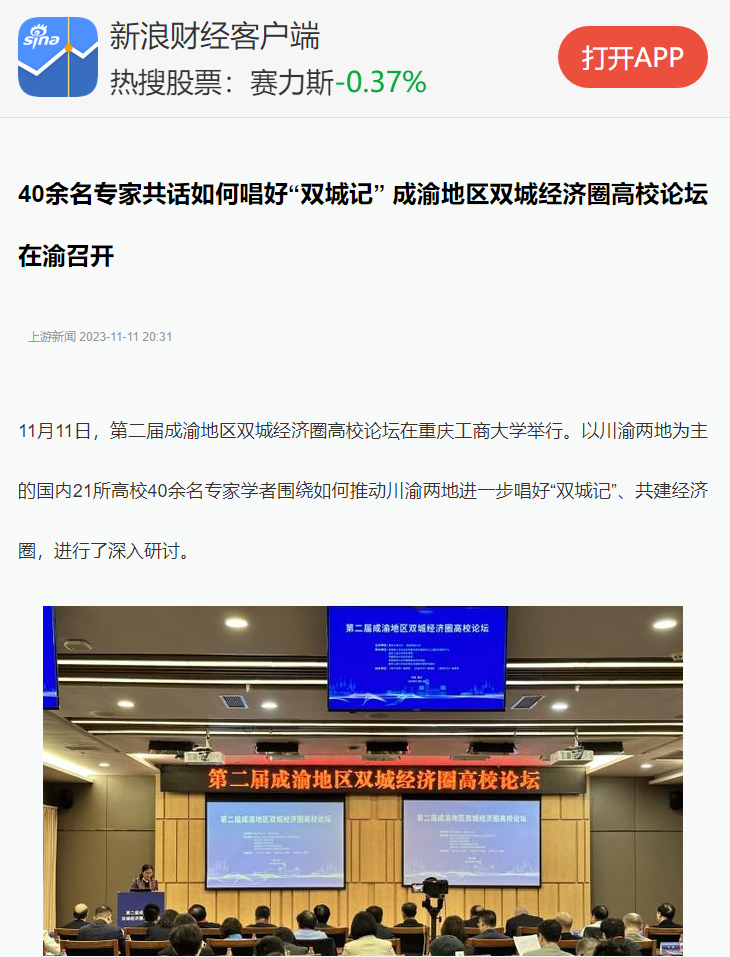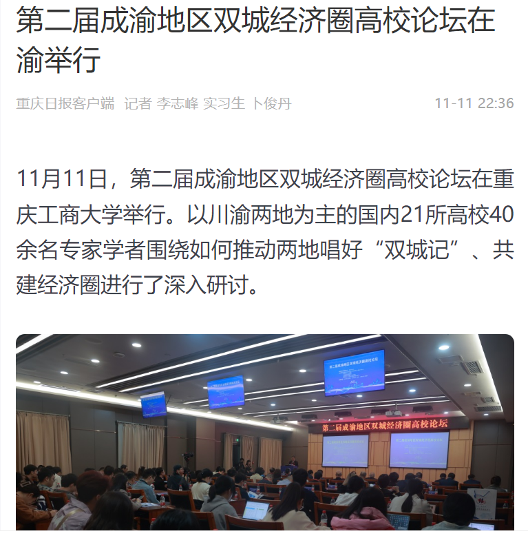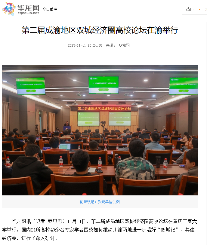 11月11日,由pp电子平台官网入口、西南财经大学主办,教育部人文社会科学重点研究基地长江上游经济研究中心、pp电子平台官网入口经济学院等单位联合承办的第二届成渝地区双城经济圈高校论坛在pp电子举办。重庆日报客户端、上游新闻、华龙网、今日头条等多家媒体对本次论坛进行了报道。