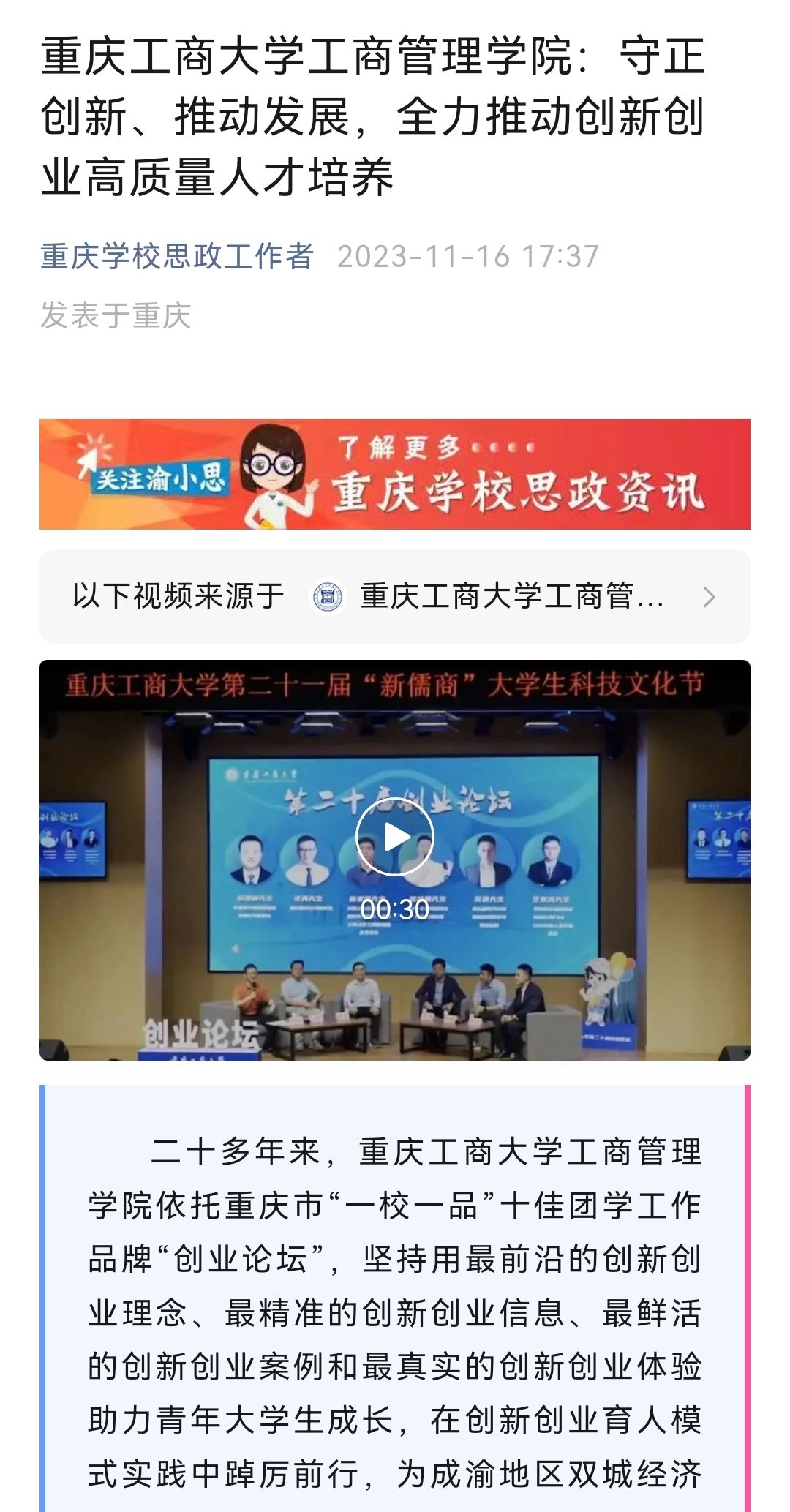 市教委“重庆学校思政工作者”微信公众号报道学校推动创新创业高质量人才培养