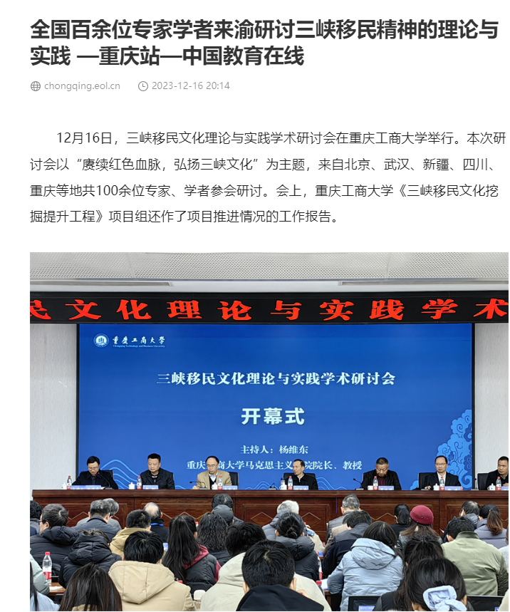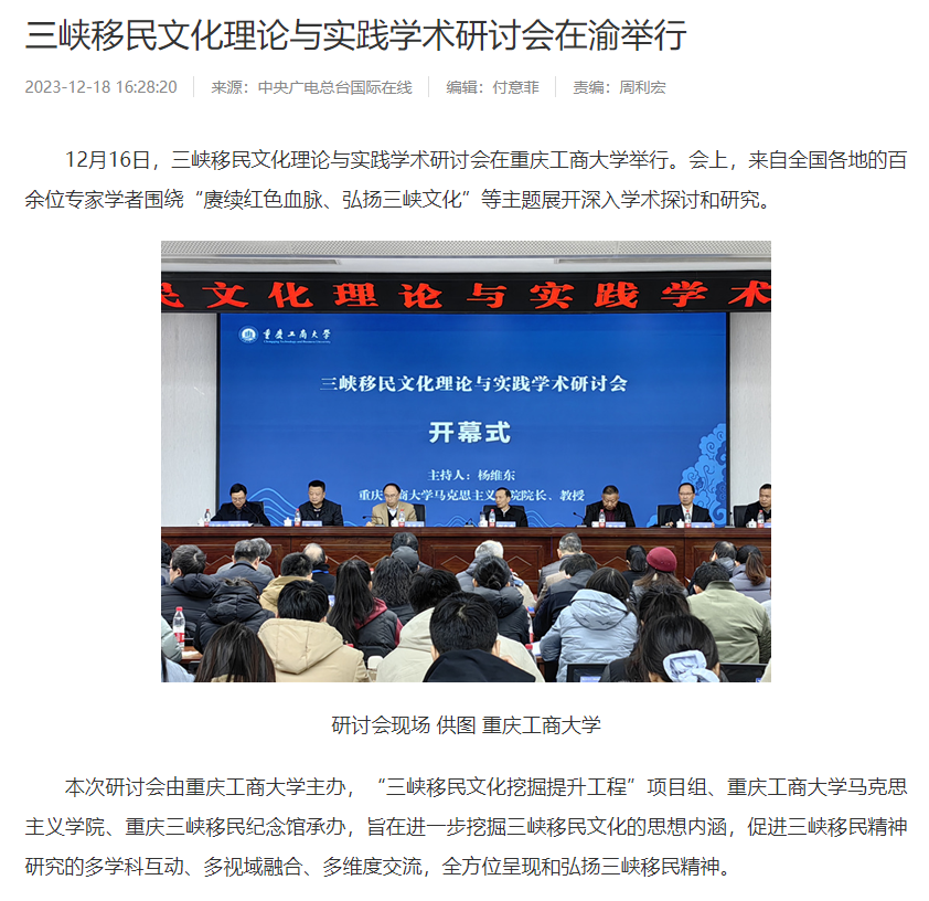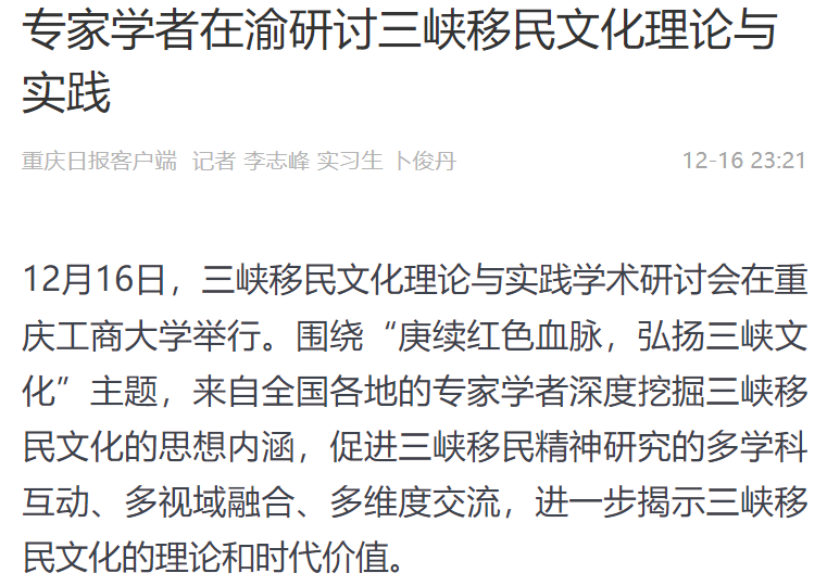 12月16日,三峡移民文化理论与实践学术研讨会在pp电子平台官网入口召开,本次研讨会以“庚续红色血脉,弘扬三峡文化”为主题,由pp电子平台官网入口主办,“三峡移民文化挖掘提升工程”项目组、pp电子平台官网入口马克思主义学院、重庆三峡移民纪念馆承办。来自北京、武汉、四川、重庆、新疆等地共100余位领导、专家、学者参加了会议。中央广电总台国际在线、环球时报网、重庆日报客户端、华龙网、中国教育在线等多家媒体对本次论坛进行了报道。
