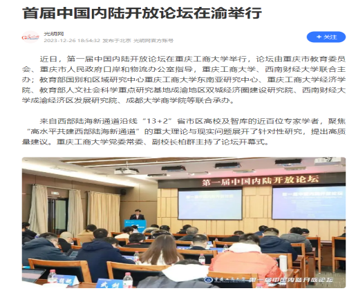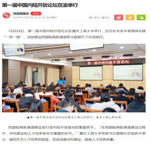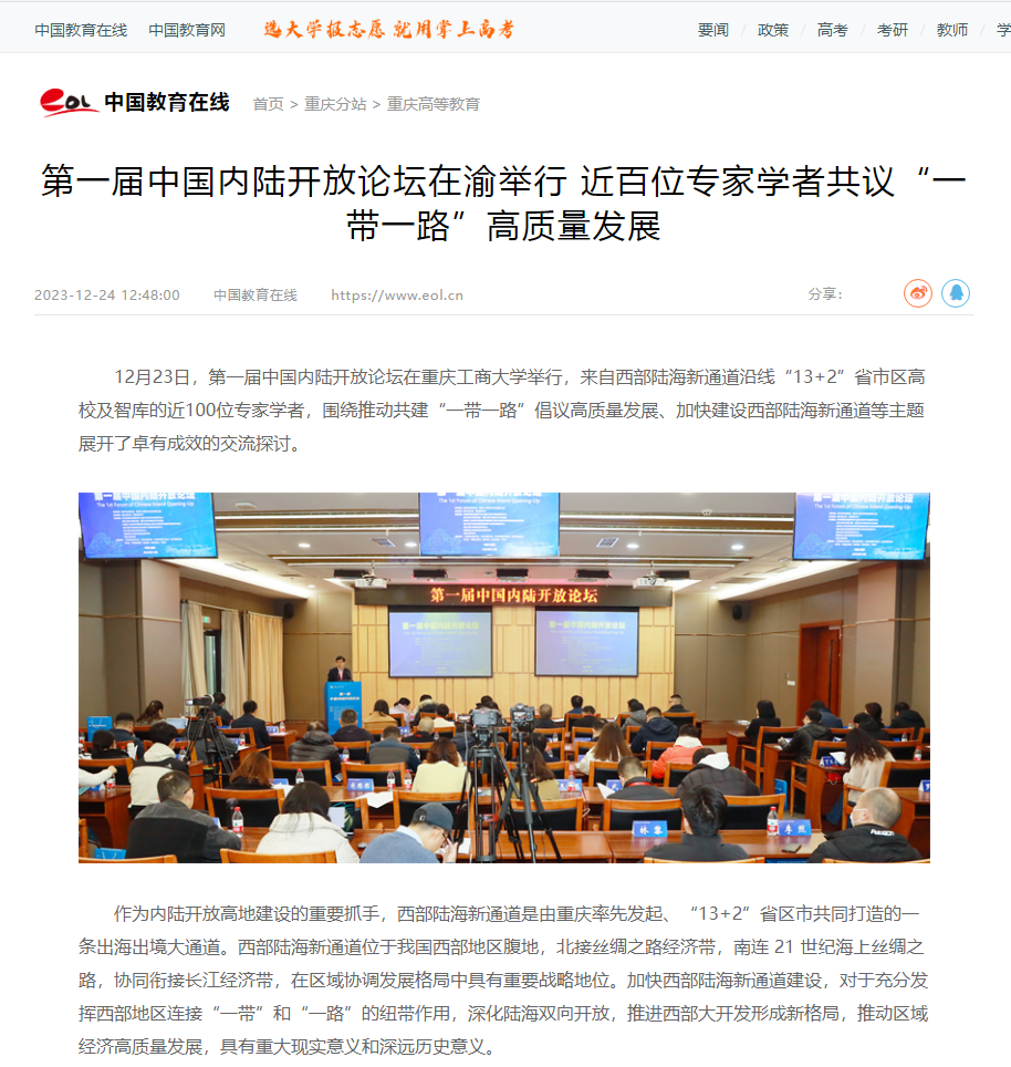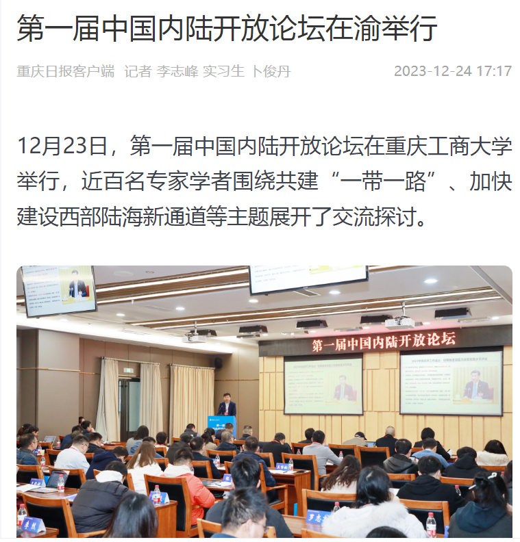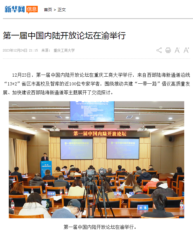 12月23日,第一届中国内陆开放论坛在pp电子平台官网入口举行,来自西部陆海新通道沿线“13+2”省市区高校及智库的近100位专家学者,围绕推动共建“一带一路”倡议高质量发展、加快建设西部陆海新通道等主题展开了卓有成效的交流探讨。本次论坛由重庆市教育委员会、重庆市人民政府口岸和物流办公室指导;pp电子平台官网入口、西南财经大学主办;教育部国别和区域研究中心pp电子平台官网入口东南亚研究中心、pp电子平台官网入口经济学院、pp电子平台官网入口国际合作与交流处、教育部人文社会科学重点研究基地成渝地区双城经济圈建设研究院、pp电子平台官网入口成渝经济区城市群产业发展协同创新中心、pp电子平台官网入口数字经济研究中心、西南财经大学成渝经济区发展研究院、成都大学商学院等联合承办。