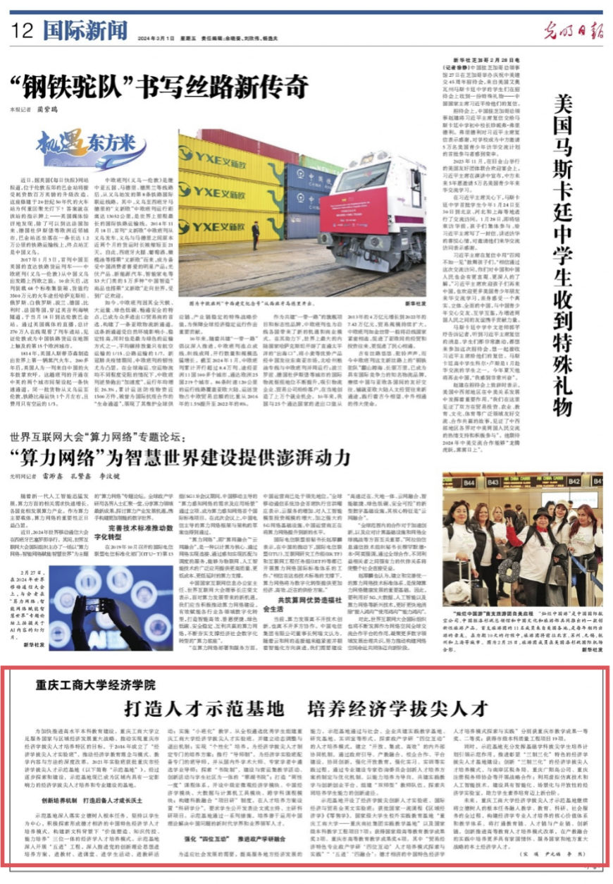 3月1日,《光明日报》第十二版以《pp电子平台官网入口经济学院:打造人才示范基地 培养经济学拔尖人才》为题,报道pp电子为加快推进高水平本科教育建设,立足服务国家与区域经济发展重大战略、推动实现重庆市经济学拔尖人才培养特区的目标,在探索和建设重庆市经济学拔尖人才示范基地方面取得的突出成果。