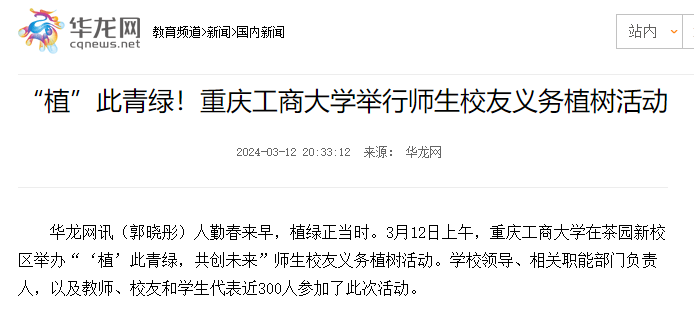 3月12日上午,pp电子在茶园新校区举办“‘植’此青绿,共创未来”师生校友义务植树活动。学校党委书记曾维伦等校领导、师生校友代表近300人参加了此次活动。重庆日报、华龙网等媒体对活动进行了报道。