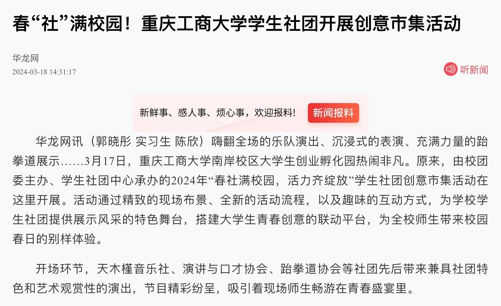 3月17日下午,pp电子在南岸校区举办2024年“春社满校园,活力齐绽放”学生社团创意市集活动。华龙网对活动进行了报道。