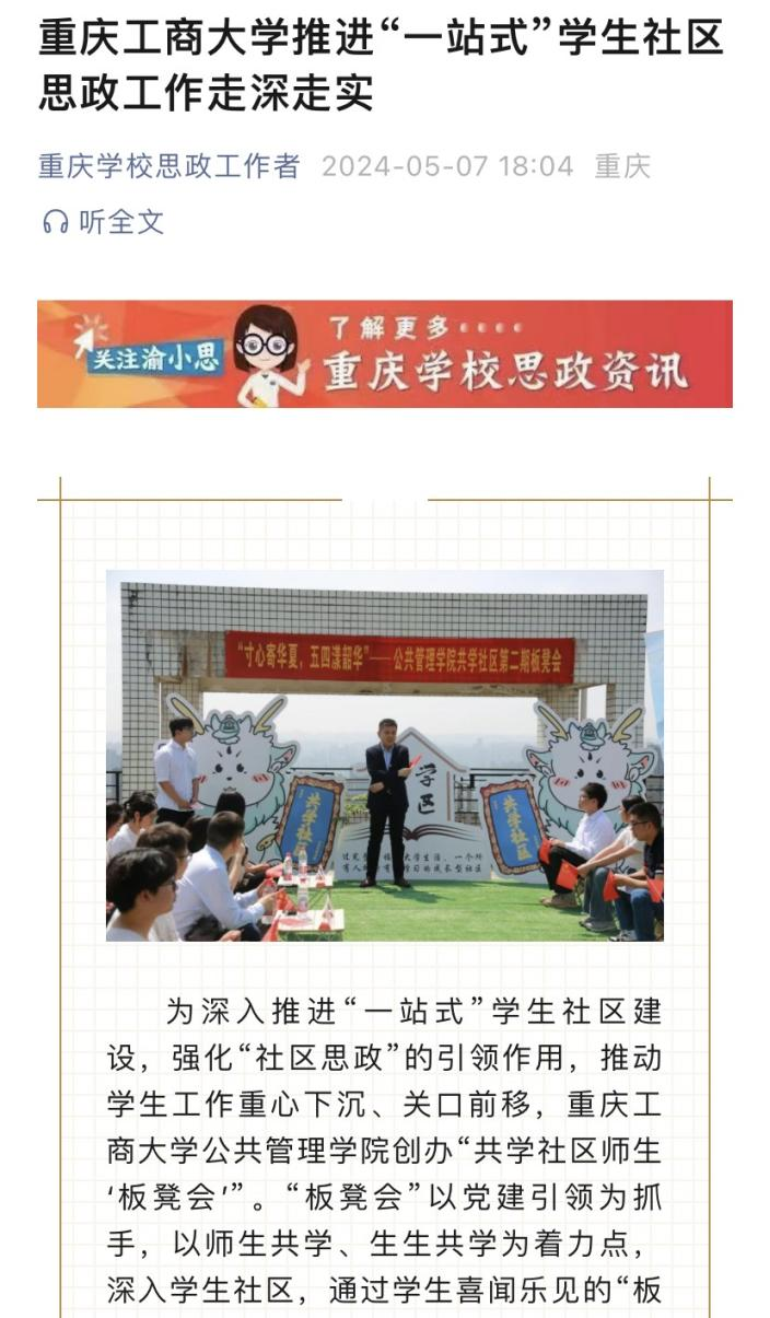 近日,重庆市教委“重庆学校思政工作者”微信公众号对pp电子公共管理学院“一站式”学生社区思政工作进行了详细报道。