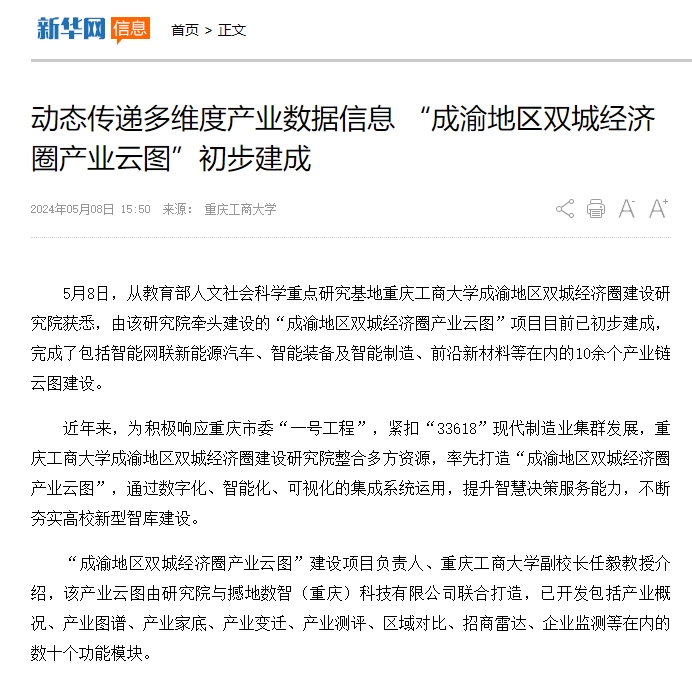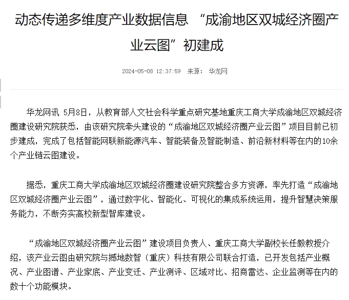 近年来,为积极响应重庆市委“一号工程”,紧扣“33618”现代制造业集群发展,pp电子教育部人文社会科学重点研究基地-成渝地区双城经济圈建设研究院整合多方资源,率先打造“成渝地区双城经济圈产业云图”,通过数字化、智能化、可视化的集成系统运用,提升智慧决策服务能力,不断夯实高校新型智库建设,完成了包括智能网联新能源汽车、智能装备及智能制造、前沿新材料等在内的10余个产业链云图建设。新华网、华龙网对此进行了报道。