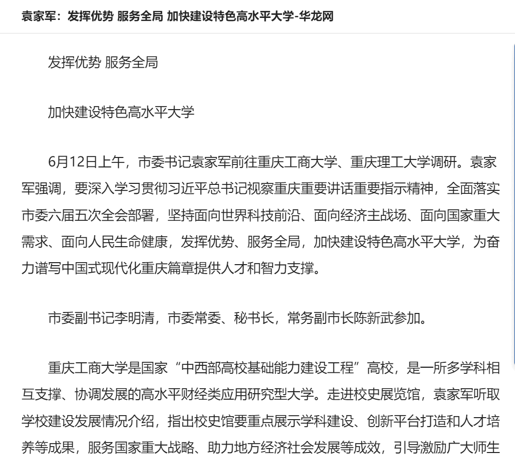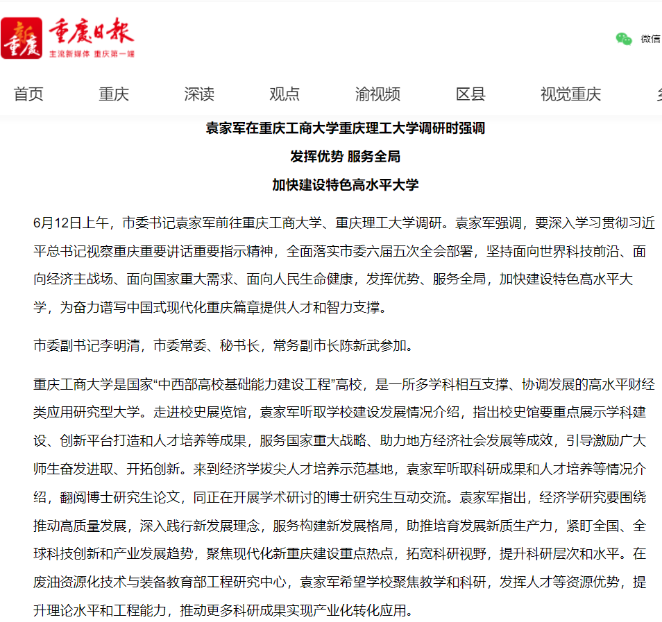 6月12日上午,市委书记袁家军前往pp电子调研。袁家军强调,要深入学习贯彻习近平总书记视察重庆重要讲话重要指示精神,全面落实市委六届五次全会部署,坚持面向世界科技前沿、面向经济主战场、面向国家重大需求、面向人民生命健康,发挥优势、服务全局,加快建设特色高水平大学,为奋力谱写中国式现代化重庆篇章提供人才和智力支撑。重庆新闻联播、《重庆日报》和华龙网对此进行了报道。