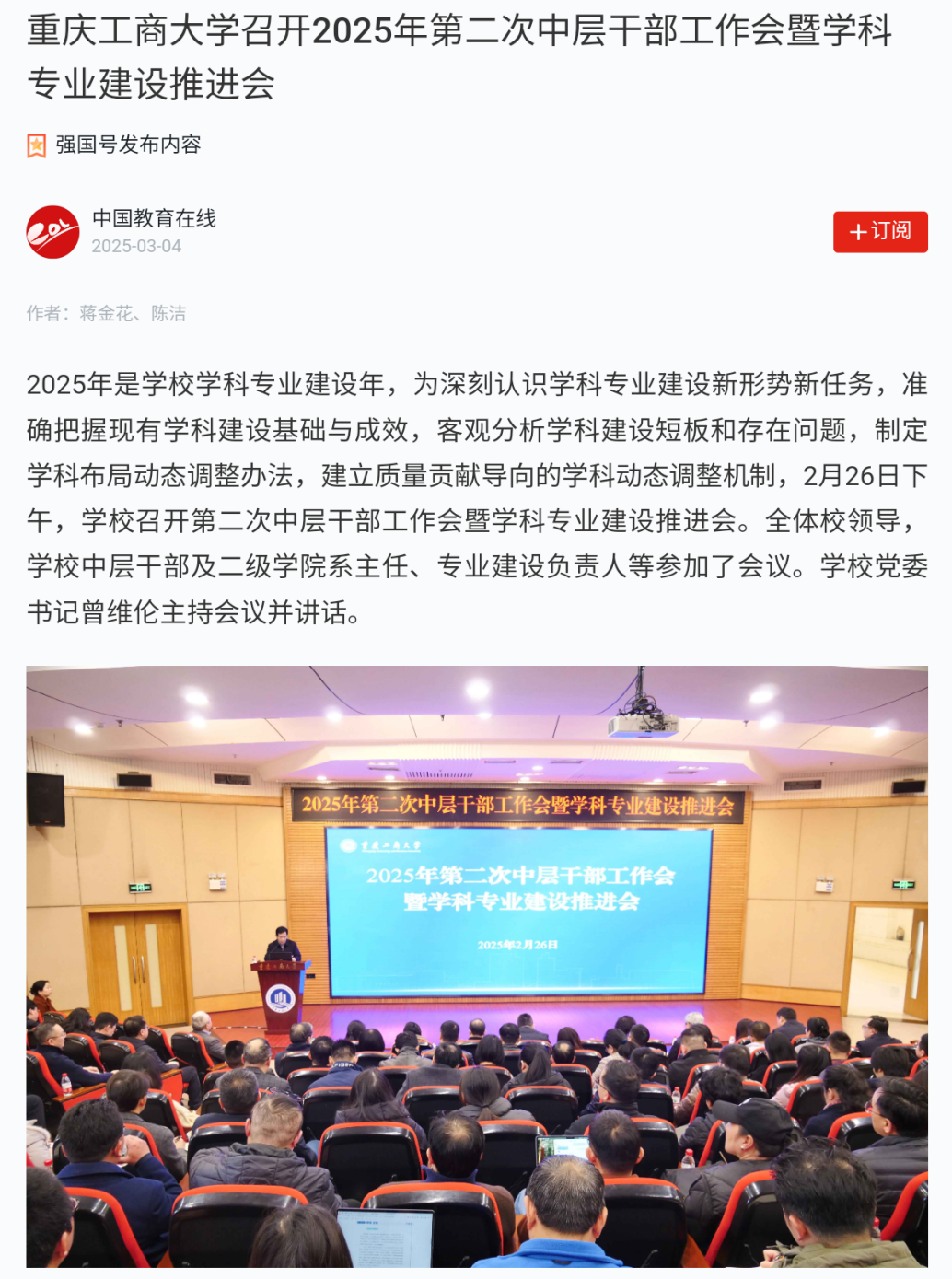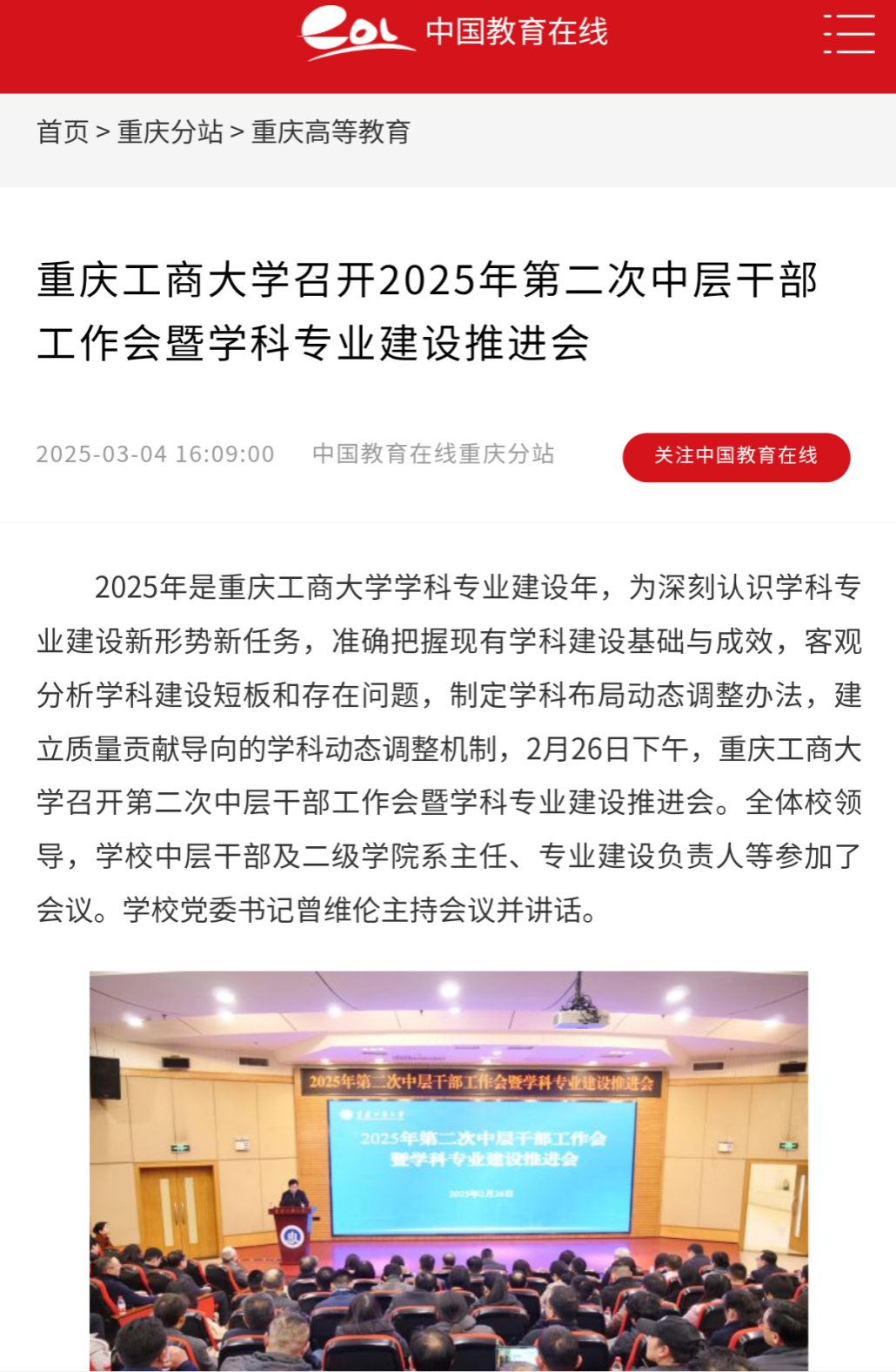 2025年是学校学科专业建设年,为深刻认识学科专业建设新形势新任务,准确把握现有学科建设基础与成效,客观分析学科建设短板和存在问题,制定学科布局动态调整办法,建立质量贡献导向的学科动态调整机制,2月26日下午,学校召开第二次中层干部工作会暨学科专业建设推进会。全体校领导,学校中层干部及二级学院系主任、专业建设负责人等参加了会议。学校党委书记曾维伦主持会议并讲话。学习强国平台和中国教育在线详细报道了会议。