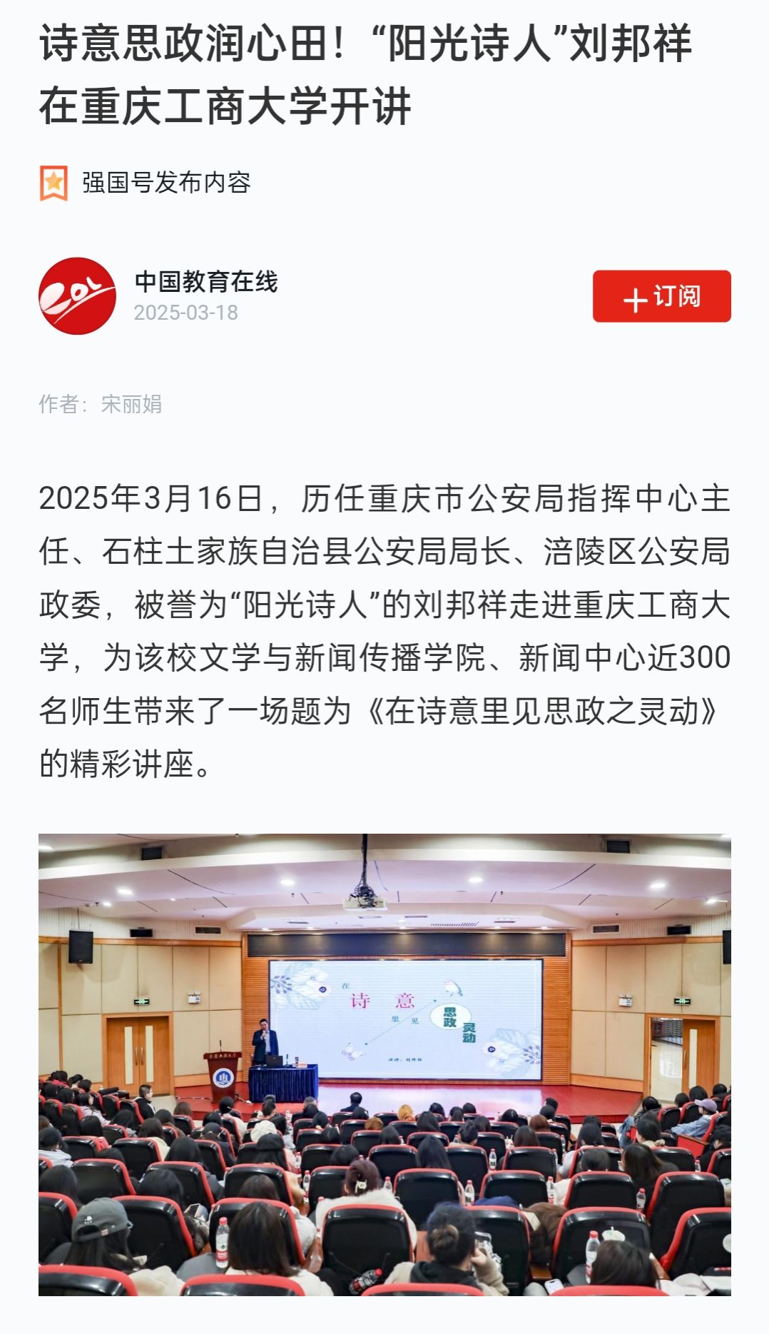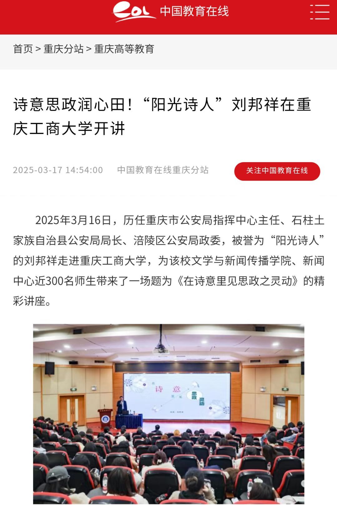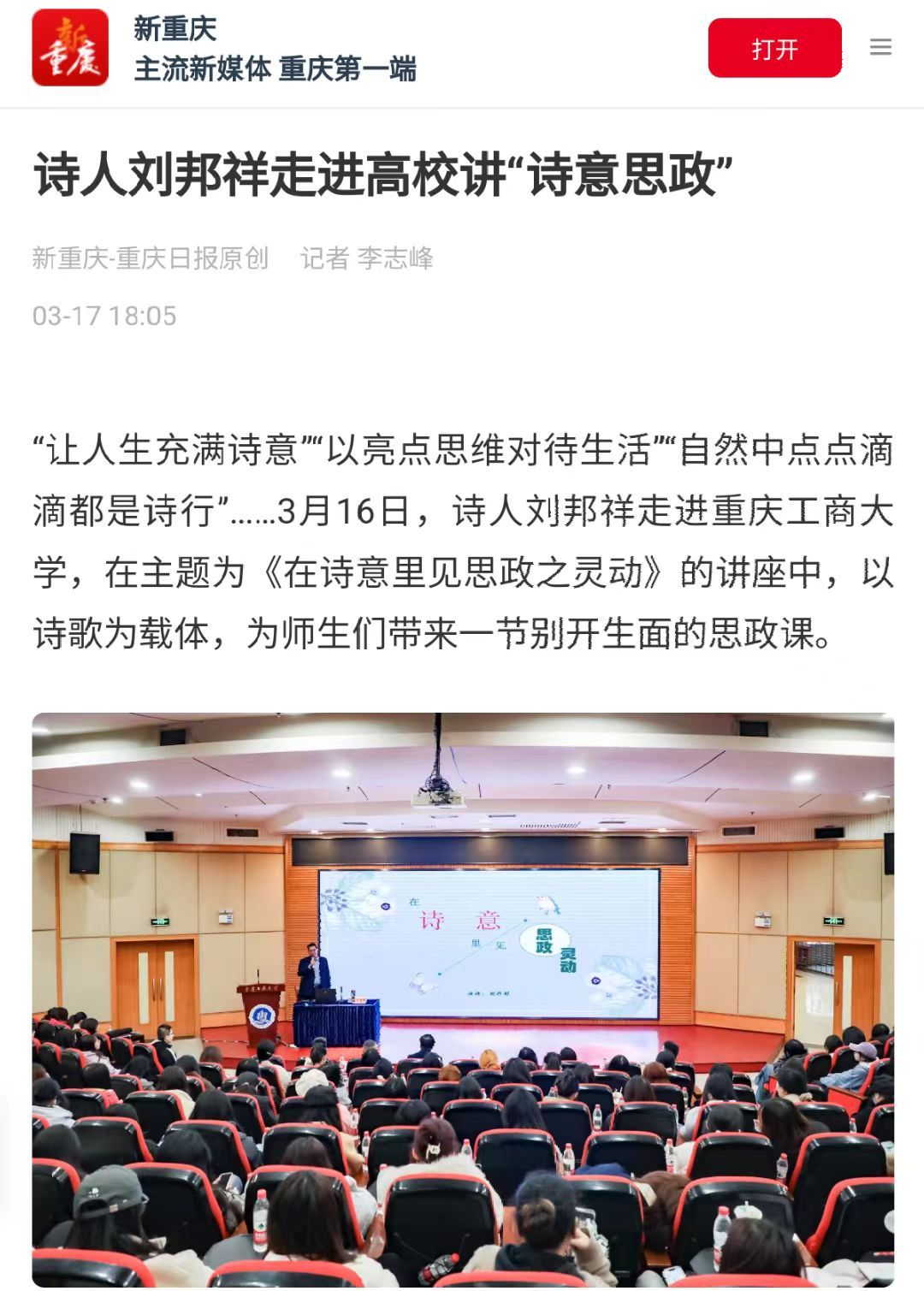 3月16日下午,“在诗意里见思政之灵动”主题讲座在pp电子博智楼7200报告厅成功举办。本次讲座由学校党委宣传部、文学新闻学院共同主办,特邀历任重庆市公安局指挥中心主任、石柱县公安局局长、涪陵区公安局政委,重庆市公安局一级警务专员,被誉为“阳光诗人”的刘邦祥担任主讲人。新重庆-重庆日报客户端、学习强国和中国教育在线对此活动进行了报道。