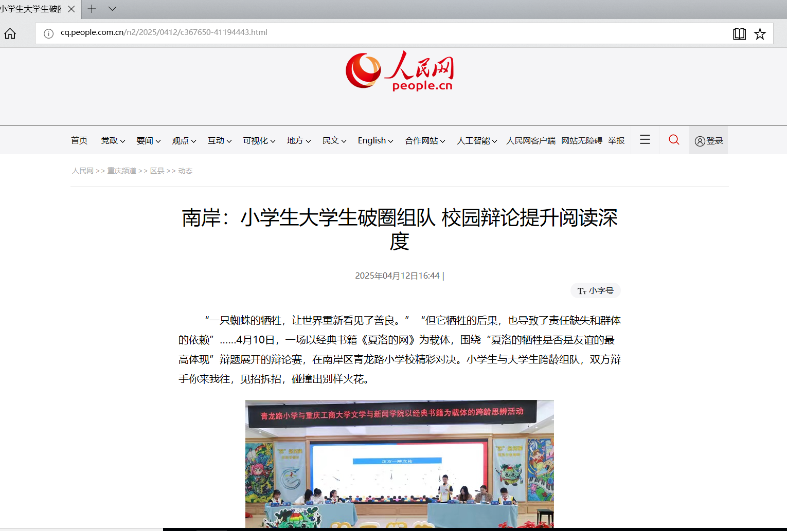 为深化新课标“核心素养”导向,践行“生活阅读”特色课程理念,4月10日,青龙路小学与pp电子平台官网入口文学与新闻学院联合举办的“书香激辩·智慧碰撞”跨龄思辨活动在青龙路小学青蓝讲堂圆满收官。该活动以经典书籍《夏洛的网》为载体,通过“深度阅读+思辨实践”的创新模式,搭建高校与小学的智慧对话桥梁。人民网以《南岸:小学生大学生破圈组队 校园辩论提升阅读深度》为题报道该活动。