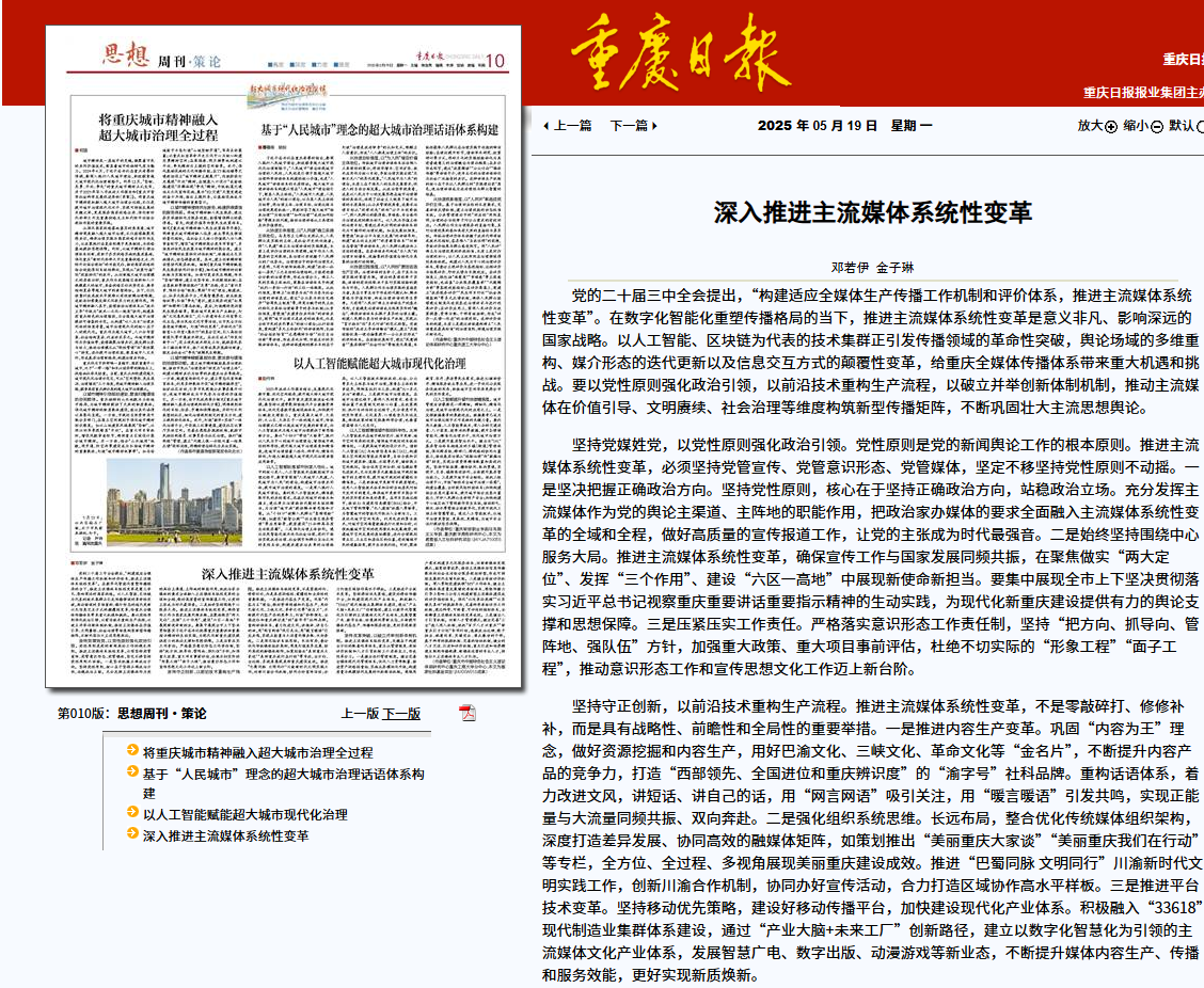 《重庆日报》思想周刊登载pp电子教师撰写文章《深入推进主流媒体系统性变革》