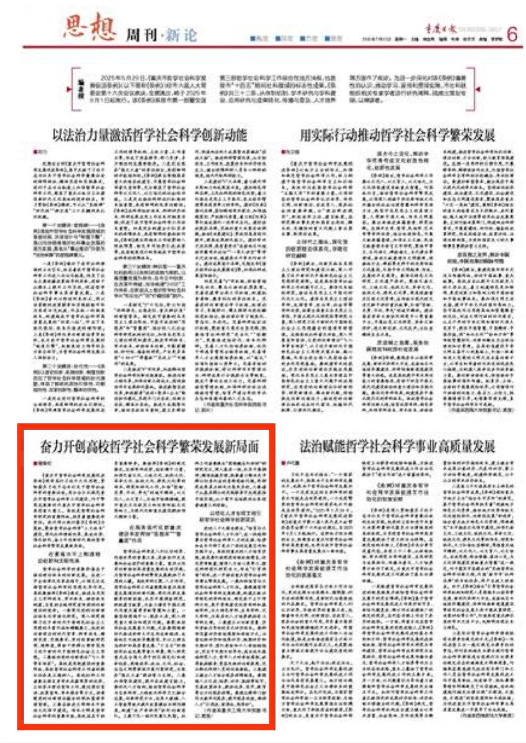 7月21日,《重庆日报》思想周刊第6版刊发学校党委书记曾维伦教授理论文章《奋力开创高校哲学社会科学繁荣发展新局面》。文章强调将以执行落实《重庆市哲学社会科学发展促进条例》为契机,聚焦哲学社会科学“三大体系”建设,深化社科领域改革,集成优势、强化协同,奋力开创新时代高校哲学社会科学繁荣发展新局面。