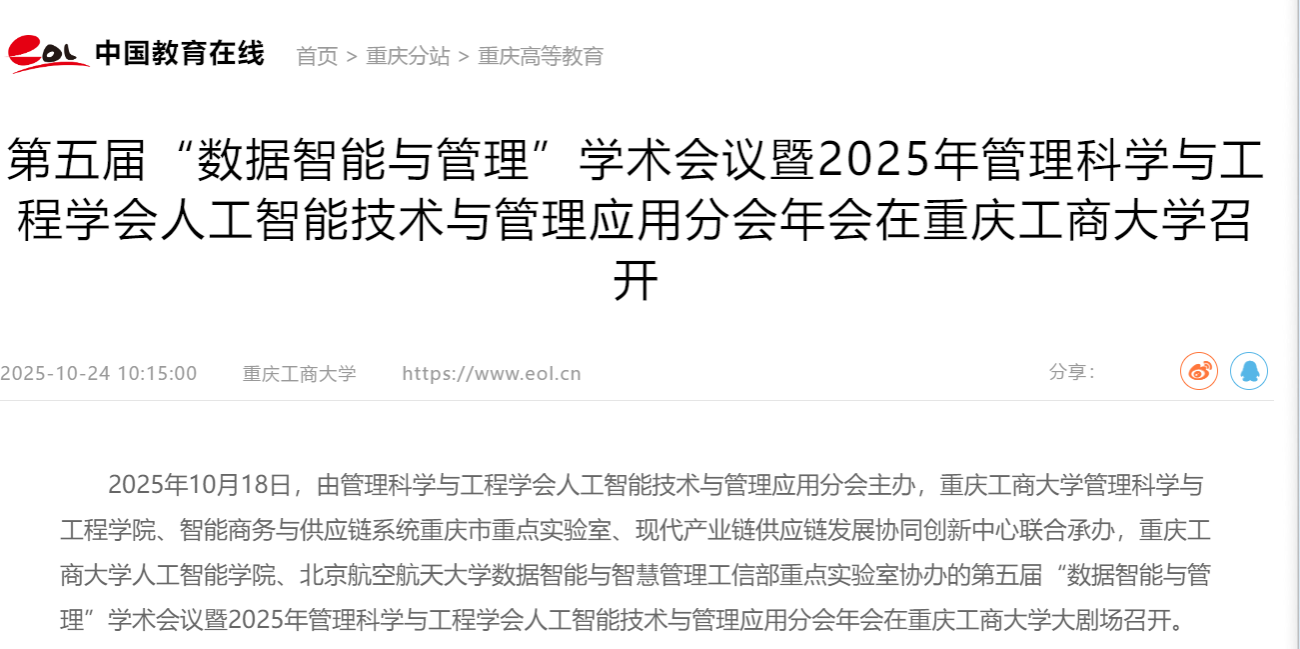 新重庆-重庆日报以《第五届数据智能与管理学术会议在渝举行》为题,中国教育在线以《“第五届“数据智能与管理”学术会议暨2025年管理科学与工程学会人工智能技术与管理应用分会年会在pp电子平台官网入口召开》为题,华龙网以《第五届“数据智能与管理”学术会议暨2025年管理科学与工程学会人工智能技术与管理应用分会年会在pp电子平台官网入口召开》为题纷纷报道了本次活动。