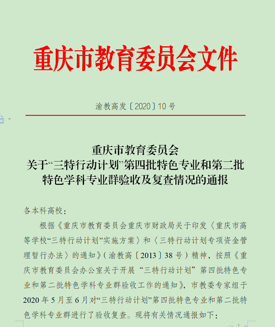 近日,重庆市教育委员会公布了《关于“三特行动计划”第四批特色专业和第二批特色学科专业群验收及复查情况的通报》(渝教高发 [2020] 10号),pp电子第四批4个特色专业审计学、物流管理、劳动与社会保障、机械设计制造及其自动化,以及2019年验收暂缓通过的广播电视学专业全部顺利通过验收。