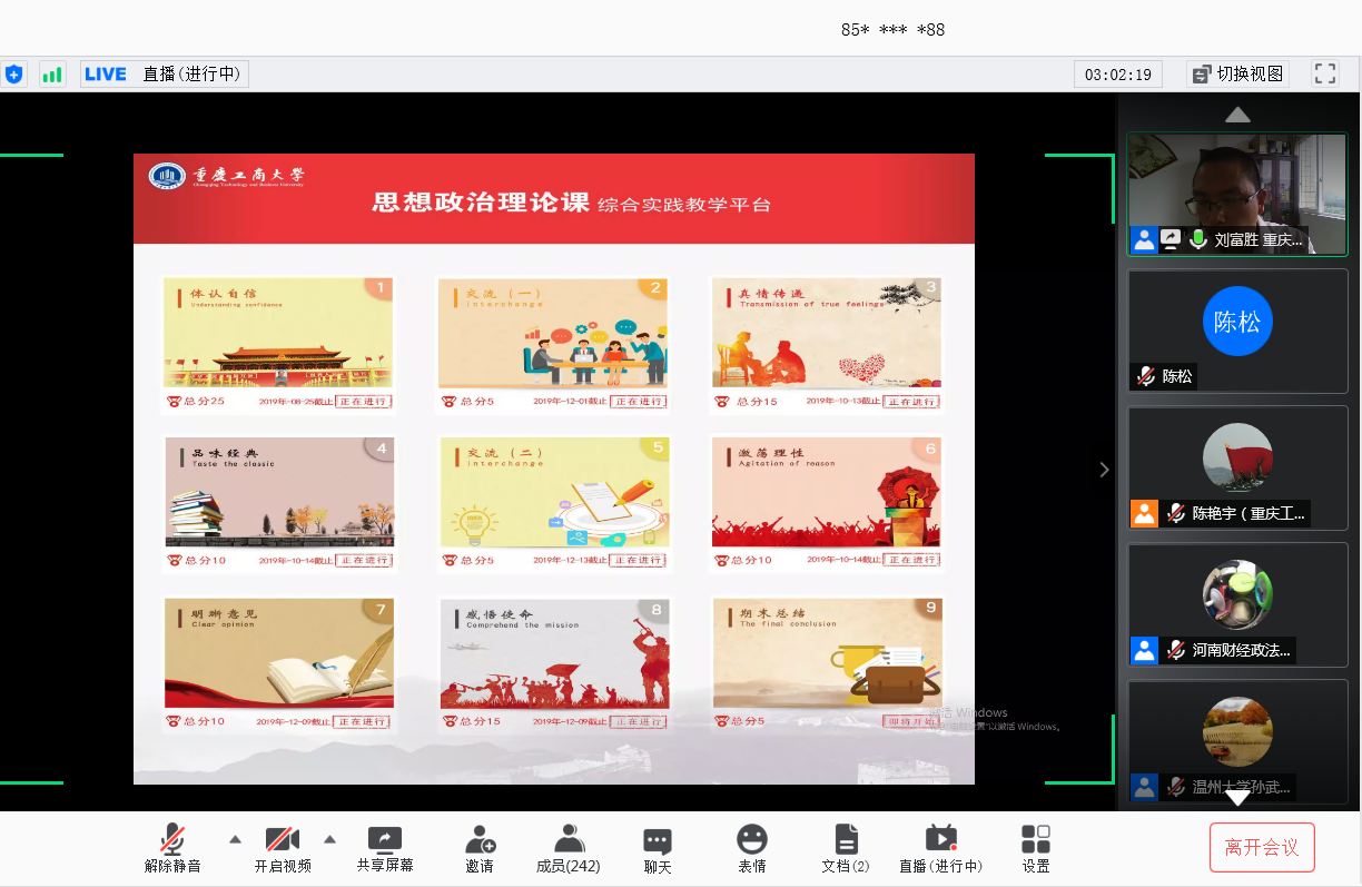 李志雄书记对各位专家学者参与会议表示热烈欢迎。他指出,学校党委和行政高度重视马克思主义学院、马克思主义理论学科和思想政治理论课建设,积极打造思想政治理论课金课。学校马克思主义学院全力提升思想政治理论课实效,按照“政治高度、理论深度、课堂热度和持续效度”的评价标准,重点推进专题化教学、综合化实践、立体化考核等三大改革。学校长期坚持思想政治理论课实践教学探索,上个世纪末开展的“家长学生两地书”活动,入选了中共中央宣传部宣教司、教育部社会科学司与思想政治工作司、共青团中央学校部主编的《加强和改进大学生思想政治教育优秀案例选编》,中央电视台、人民日报、光明日报、中国青年报、中国教育报等全国百余家主流媒体进行了报道。2017年开始,pp电子面向全体本科生开设了《思想政治理论课综合实践》公共必修课,对思想政治理论课实践教学进行了新探索,并取得较好效果。“‘互联网+’环境下高校思想政治理论课实践教学‘三结合’模式探索”入选2019年度教育部高校思想政治理论课教学方法改革项目择优推广计划,“思想政治理论课综合实践”被重庆市教委推荐参评国家级本科一流课程,“‘三支撑三覆盖两结合’的思想政治理论课实践育人模式”入选2020年全国高校思想政治工作精品项目。李书记强调,pp电子在思想政治理论课建设方面取得的成绩与兄弟院校专家学者的帮助密不可分,在疫情防控期间通过网络召开这次云端会议,就是要进一步聆听专家学者的意见建议,进一步学习兄弟高校的先进经验,进一步推动思想政治理论课实践教学创新,进一步彰显“思想政治理论课是落实立德树人根本任务的关键课程”的地位和作用。