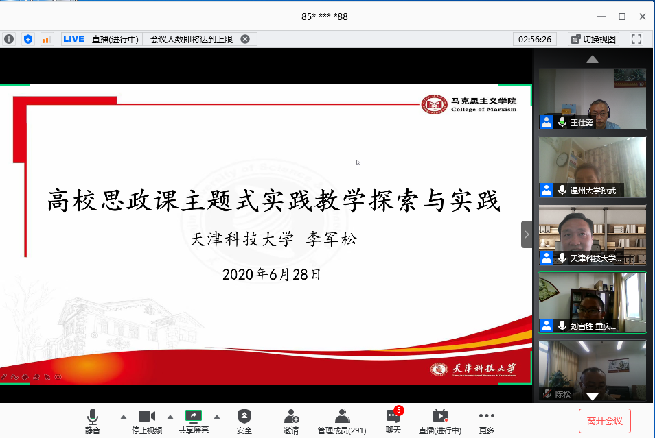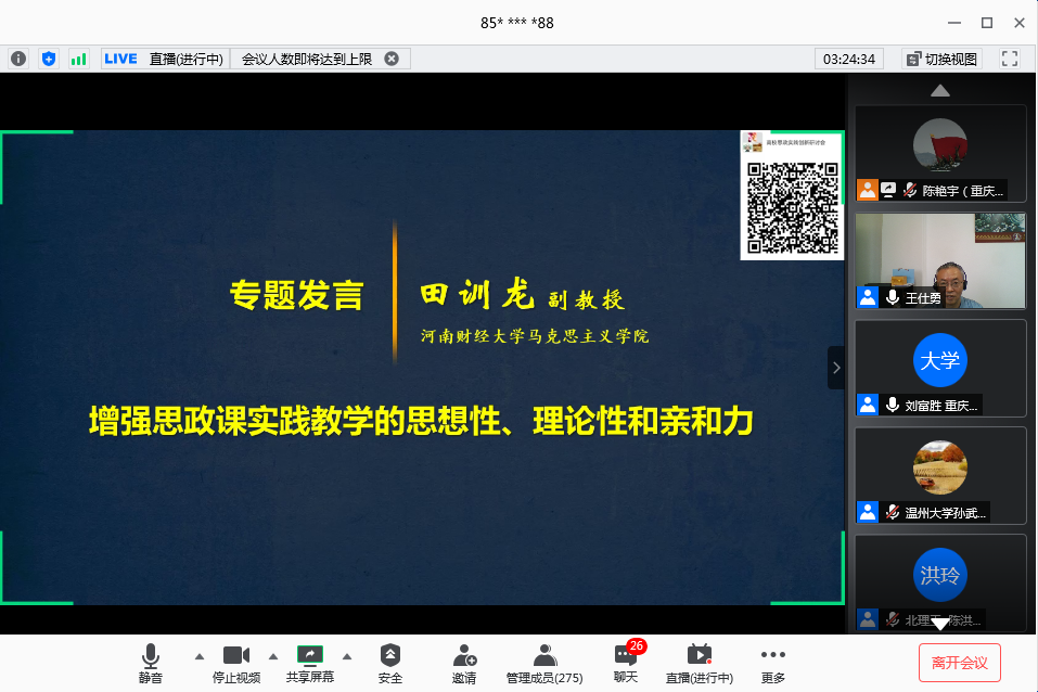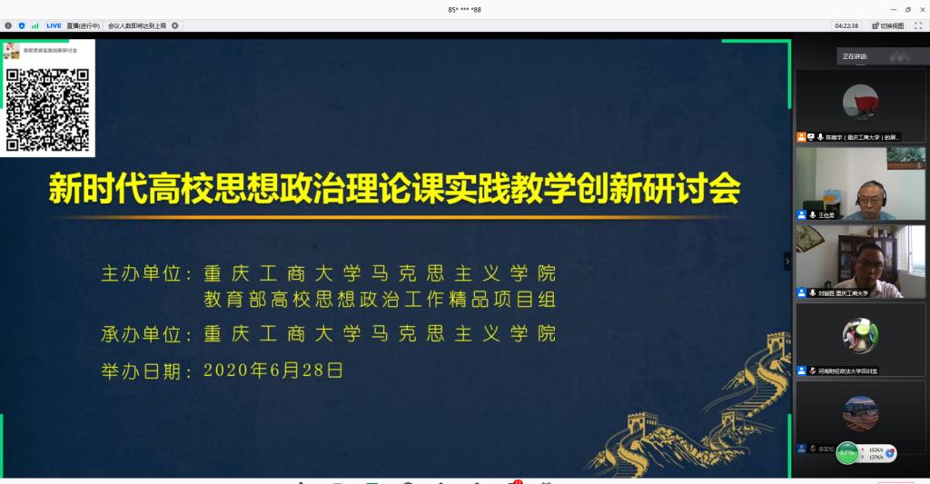6月28日上午,由pp电子平台官网入口马克思主义学院、教育部高校思想政治工作精品项目组主办的“新时代高校思想政治理论课实践教学创新研讨会”在腾讯会议平台召开。来自清华大学、北京理工大学、温州大学、天津科技大学、河南财经政法大学和pp电子平台官网入口的六所高校的专家做了主题报告或专题发言。学校党委书记李志雄同志出席会议并致辞。来自全国106所高校的300余位专家学者参加了会议。会议由pp电子马克思主义学院院长王仕勇主持。