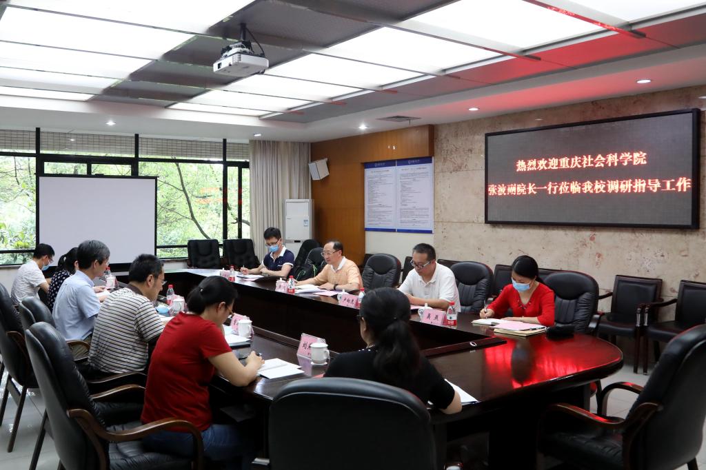5月21日下午,重庆社会科学院副院长张波、智库处处长卢向虎和有关工作人员一行到pp电子调研座谈。校长孙芳城、副校长柏群,社科处处长曾庆均和有关工作人员在3019会议室参加调研。座谈会由柏群主持。