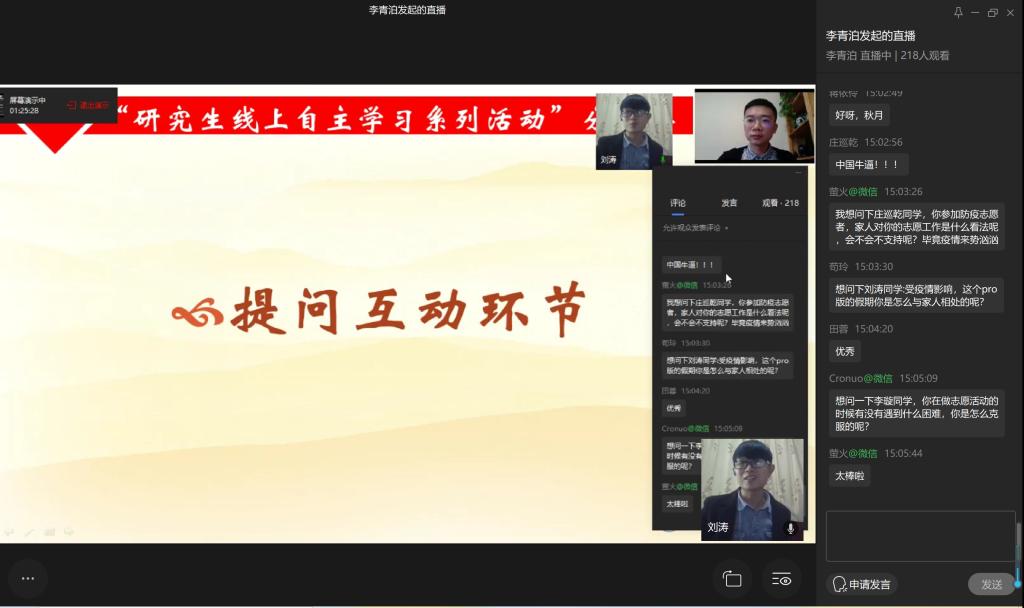为回顾和总结前期研究生线上自主学习“四个一”系列活动中同学们取得的成绩,同时激发和引领更多的研究生同学在居家抗疫期间坚持不懈的积极学习,4月3日下午两点,研工部、研究生院主办举行了“研究生线上自主学习‘四个一’系列活动”“分享会”云直播。活动以访谈的形式,邀请了在“四个一”活动中表现突出的五位同学进行分享,研工部、研究生院领导、老师以及近500名研究生出席了本次活动。活动由研究生会副主席李青泊担任主持人。