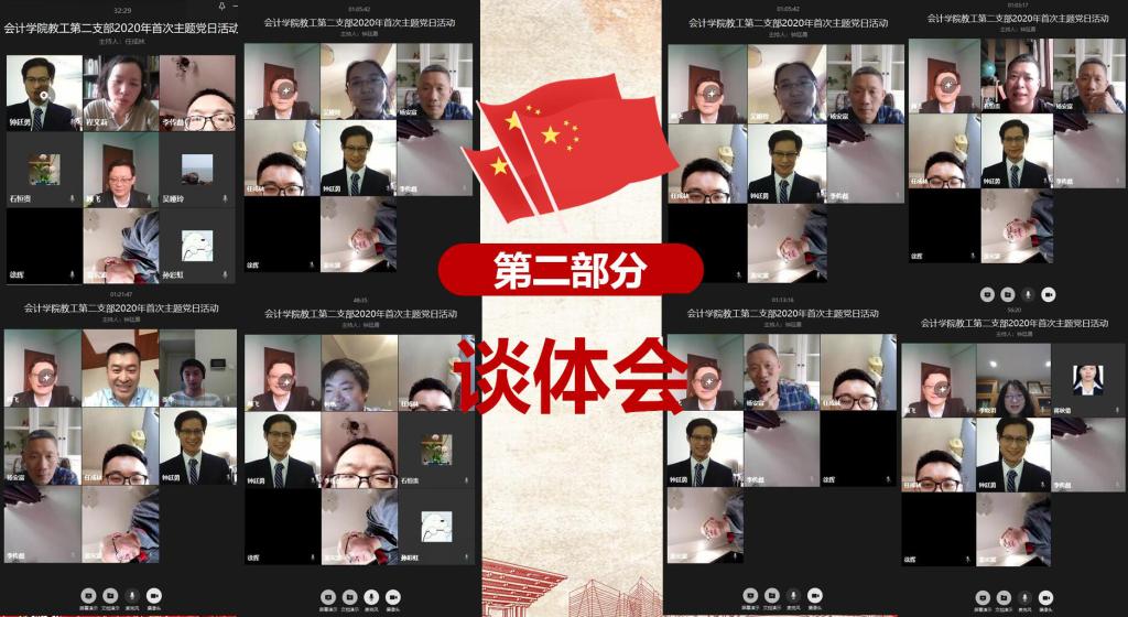 为了策划筹备好本次支部网络主题党日活动,会计学院教工二支部的支委们相继通过微信支委群和企业微信会议等方式开展了大量的前期策划准备工作。支部书记钟廷勇以及全体支委委员秉持“学习早一步、理解深一步、工作快一步”的理念,提前开展了对习近平总书记系列重要讲话精神的自我学习,并及时地将政治理论学习成果感悟结合所授专业课程的教学定位与教学内容有机融入到网络直播授课中,为学院广大党员教师在疫情防控网络教学期间开展好网络课程思政实践创新提供了教学示范,为进一步激发学生爱党爱国、勤学担当的家国情怀提供了更具现实感召力的课程思政价值引领。