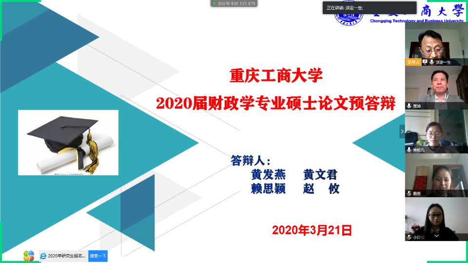 本次预答辩设财政学(1组)、金融学硕(2组),金融专硕(6组),共9组答辩会场,在岗在校的所有硕士生导师都参与了本次预答辩。财政学组由尚可文导师主持,金融学硕组由谭湘渝和骆志芳导师主持,金融专硕组由毛跃一、靳景玉、曾胜、许世琴、王兰和文传浩6名导师主持。为保障线上预答辩的顺利进行,答辩学生认真准备预答辩报告PPT,答辩专家提前2天审阅了学生提交的论文电子版并整理出了论文相关评阅意见,同时指定好每组的联络人,为正式预答辩做好准备工作。