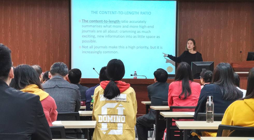 Nuno Miguel Matos Pires教授报告了他在液体中广普污染物的监测技术成果,启发拓展了废油资源化技术与装备研究中的污染物检测与控制新思路;Fadeeva Anastasia以她在俄新社、《Professional》翻译局任翻译的实践经验,原汁原味的分析、介绍了科技论文英文写作的技巧、规范、习惯、润色以及注意事项等。