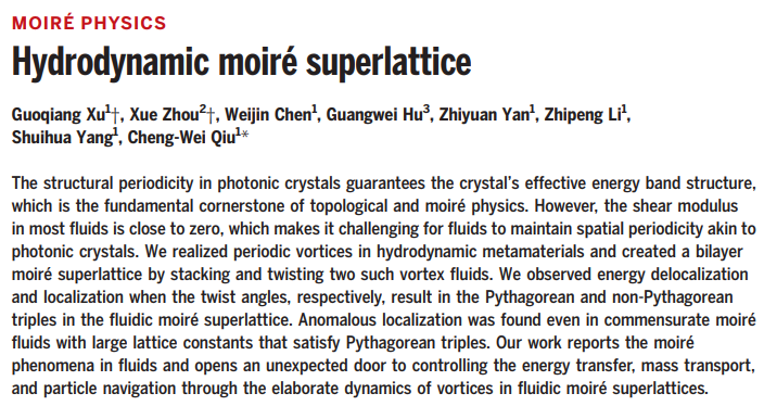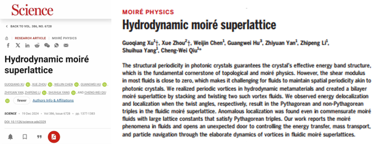 近期,pp电子人工智能学院应用物理系周雪副教授与新加坡国立大学Qiu Cheng-Wei教授团队合作,在流体输运中构建了首个莫尔超晶格并揭示了其内部的扩散场传输规律。取得的突破性研究成果发表在国际顶级期刊Science(https://www.science.org/doi/10.1126/science.adq2329 )。