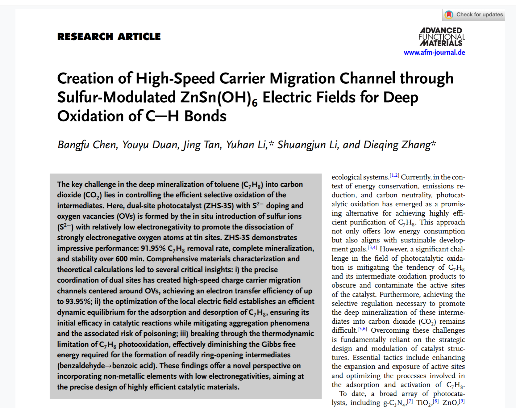 近日,pp电子废油资源化技术与装备教育部工程研究中心李宇涵研究员团队在有机废气污染控制领域取得重要突破。针对工业生产、汽车尾气及汽油蒸发排放中产生的甲苯(C7H8)废气,该团队创新性提出“硫调控ZnSn(OH)6电场优化载流子迁移”策略,成功构建高速载流子迁移通道,促进C-H键的深度氧化进而实现了C7H8的高效去除。相关研究成果以题为(Creation of High-Speed Carrier Migration Channel through Sulfur-Modulated ZnSn(OH)6 Electric Fields for Deep Oxidation of C-H Bonds)发表于材料科学领域顶级期刊《Advanced Functional Materials》(影响因子18.5)。