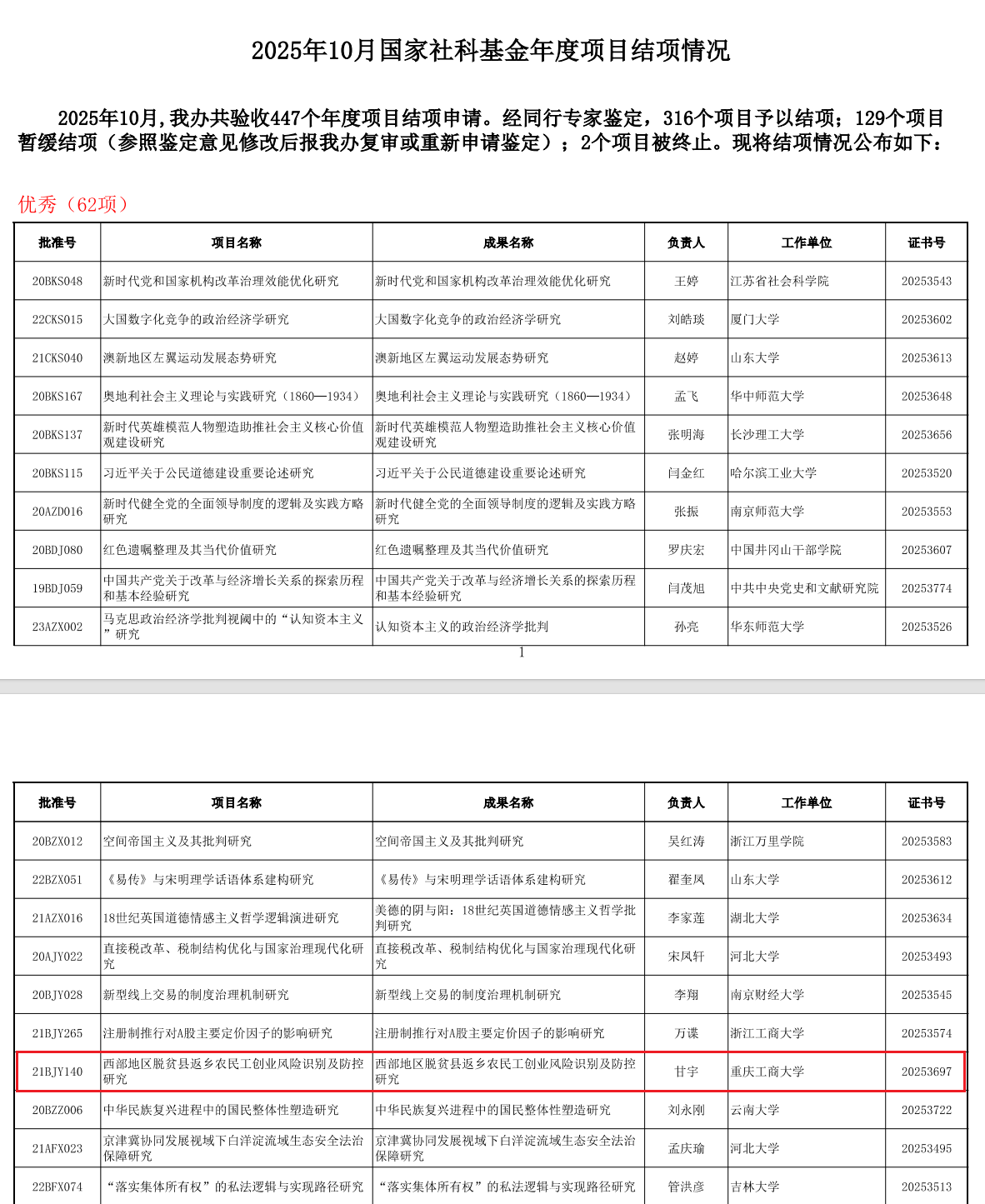 近日,全国哲学社会科学工作办公室公布2025年10月国家社科基金年度项目、青年项目和西部项目结项情况,pp电子甘宇副教授主持的国家社科基金项目“西部地区脱贫县返乡农民工创业风险识别及防控研究”(项目编号:21BJY140,结项证书编号:20253697)在结项评价中获得“优秀”等级。截至目前,今年pp电子已有3项国家社科基金项目在结项评价中获评“优秀”等级,创历史新高。