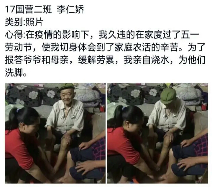 18级国营二班的杜颖嘉同学借此次机会给妈妈化妆,并且晒出了妈妈美美的妆以及合拍;18级电商一班的李琳同学选择了给妈妈拍照、做饭、做甜点,一份份可口的饭菜,穿着裙子漫步的妈妈,她写道:“我好怕留不住你的容颜,请让时光帮我记住它吧”;18级市营一班的钟艳同学选择了对家里进行一次彻底的大扫除,辛勤劳动过的房间很是干净清爽;17级国营二班的李仁娇同学晒出了一组别具一格的照片,照片中她亲自为母亲和爷爷洗脚,“为了报答爷爷和母亲,缓解劳累,我亲自烧水,为他们洗脚”,她在心得中这样写道。参与此次活动的很多同学主动记录劳动经历,与父母在朋友圈或者空间积极互动,对父母来说,子女能够在家劳动,给予他们真情陪伴,这是最好的礼物。