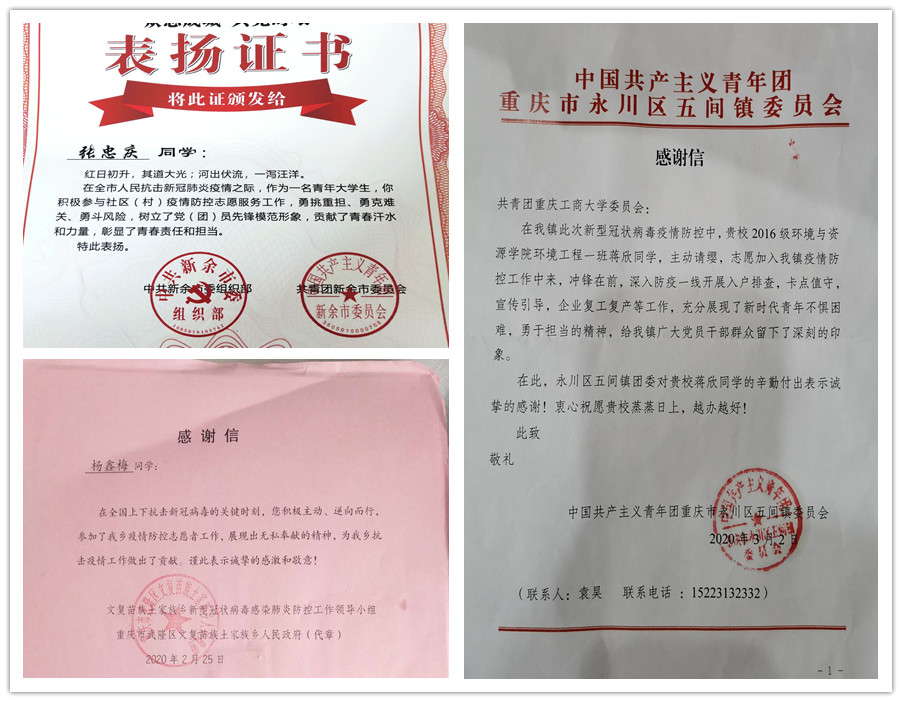 “青春由磨砺而出彩,人生因奋斗而升华”新冠肺炎疫情发生以来,重工商大志愿者们以青春的担当,迅速响应,积极投入,同在一线英勇奋战的广大疫情防控人员一道,不畏艰险、冲锋在前,为夺取疫情防控的胜利注入了鲜活的青春力量。3月以来,pp电子陆续收到河北曲周共青团、重庆永川五间镇共青团、重庆渝北区古路镇人民政府、山西临汾尧都区刘村镇马站村党支部等单位寄来的200余封感谢信,对pp电子青年在抗“疫”中的表现给予了高度的肯定和赞扬。