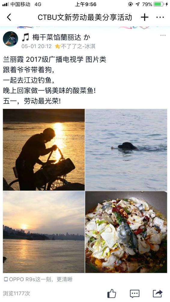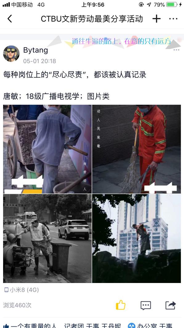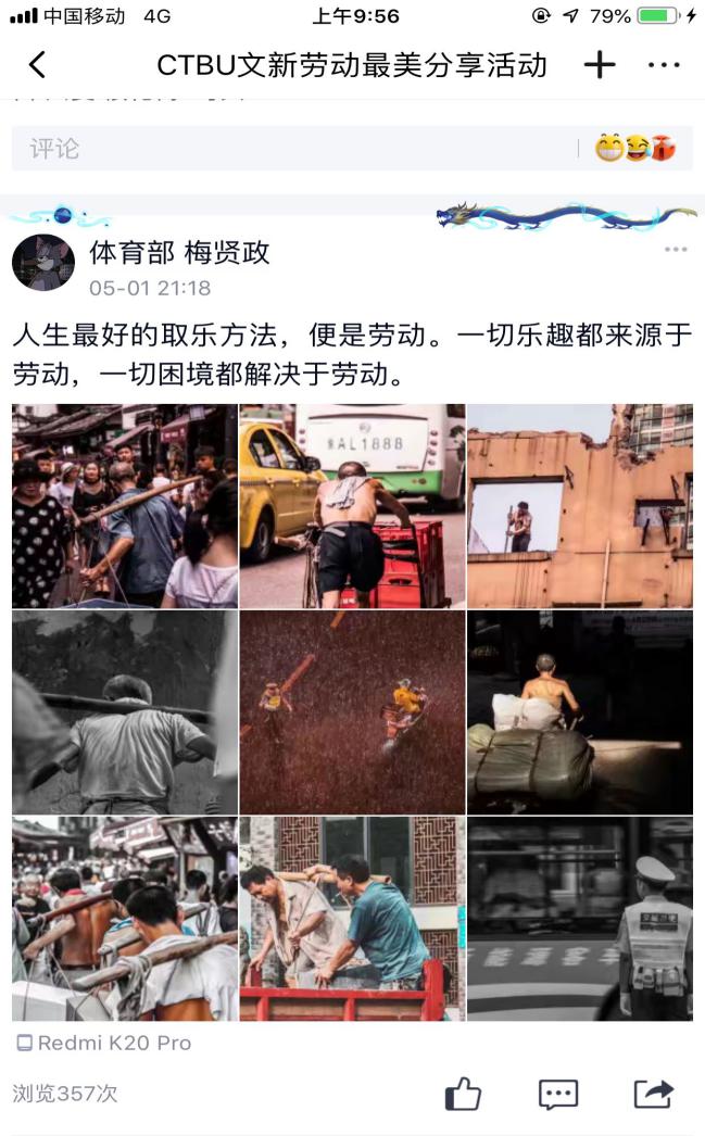因疫情滞留在家无法返校的杨念同学,借此机会学起了做饭。杨念同学在活动主题中晒出了自己在厨房做饭和出锅的食物的照片,并且在分享做菜经验的时候特意强调做红烧肉要多放白糖才美味,这样有趣的劳动分享获得同学们关注点赞。来自17级的梅贤政同学分享了一组的自己的摄影作品,作品的内容是正在工作中的“棒棒军们”。谈到拍摄过程,梅贤政说:“我走在街上看着“棒棒”在烈日下扛着沉重的货物,那一霎那我感受到了劳动人民的力量,所以我用相机记录下了这一刻。”在分享这一组精美的照片时,梅贤政用文字抒发了自己对劳动的深刻感悟:“一切乐趣都来源于劳动,一切困境都解决于劳动。”
