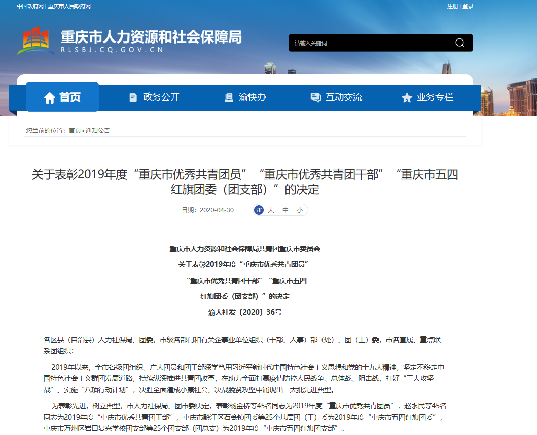 4月30日,重庆市人力资源和社会保障局共青团重庆市委员会发布《关于表彰2019年度“重庆市优秀共青团员”“重庆市优秀共青团干部”“重庆市五四红旗团委(团支部)”的决定》。其中,pp电子获评2019年度“重庆市五四红旗团委”(全市共评选25个基层团(工)委)。