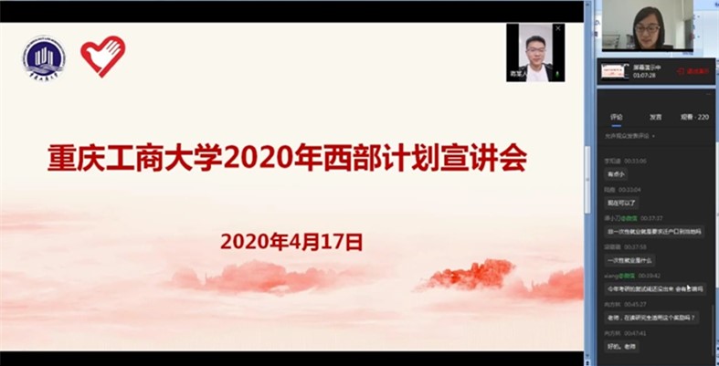 会上,校团委王微老师传达了全国项目办关于2020招募工作正式启动的相关内容和要求,同时部署了pp电子西部计划的工作安排。针对报名途径、审核流程、投递简历的方式和技巧、工作内容、福利待遇等进行了解读。招就处张广禄老师介绍了学校对于基层就业奖励的政策、申请流程及相关要求。来自重庆开州的西部计划志愿者2019届毕业生蒋超、来自新疆建设兵团十二师的西部计划志愿者2019届毕业生舒维维也来到直播间与同学们进行了交流分享。他们分享了自己参与西部计划的初衷、现任岗位的工作情况、参与西部计划的收获和未来的打算。他们扎根基层,服务人民的初心和故事感染和鼓舞了在场的每一个人。随后,校团委针对同学们存在的问题一一进行了答疑解惑。