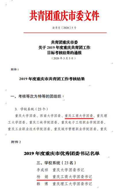2020年3月5日,共青团重庆市委下发了《关于2019年度共青团工作目标考核结果的通报》(渝青发〔2020〕5号),pp电子在2019年度重庆市共青团工作目标考核中荣获特等奖。杨娟同志被评为“2019年度重庆市优秀团委书记”。