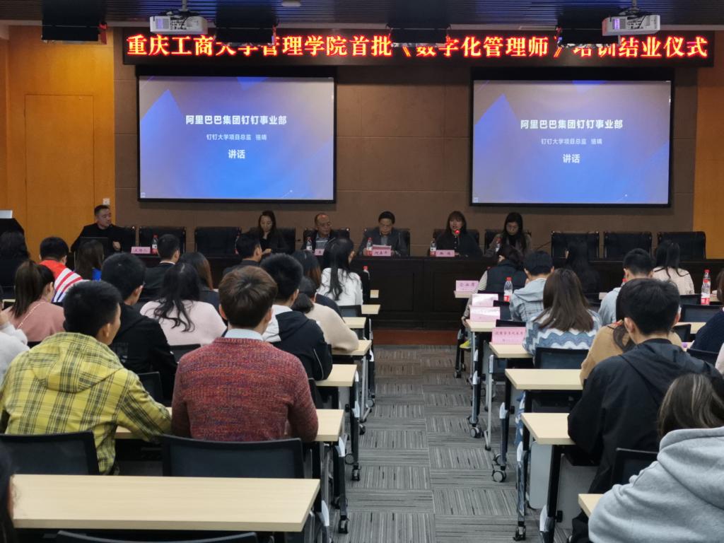 10月28日下午,管理学院携手阿里巴巴集团旗下的阿里钉钉事业部联合举办的“数字化管理师”首期培训班结业仪式暨校企双选会在图书馆多功能厅举行。学校副校长何勇平、阿里巴巴集团钉钉事业部重庆运营总监豫立、阿里巴巴集团钉钉事业部钉钉大学项目总监骆璃、管理学院分党委书记王建明、副院长周莉、企业代表、培训班学员出席了活动。