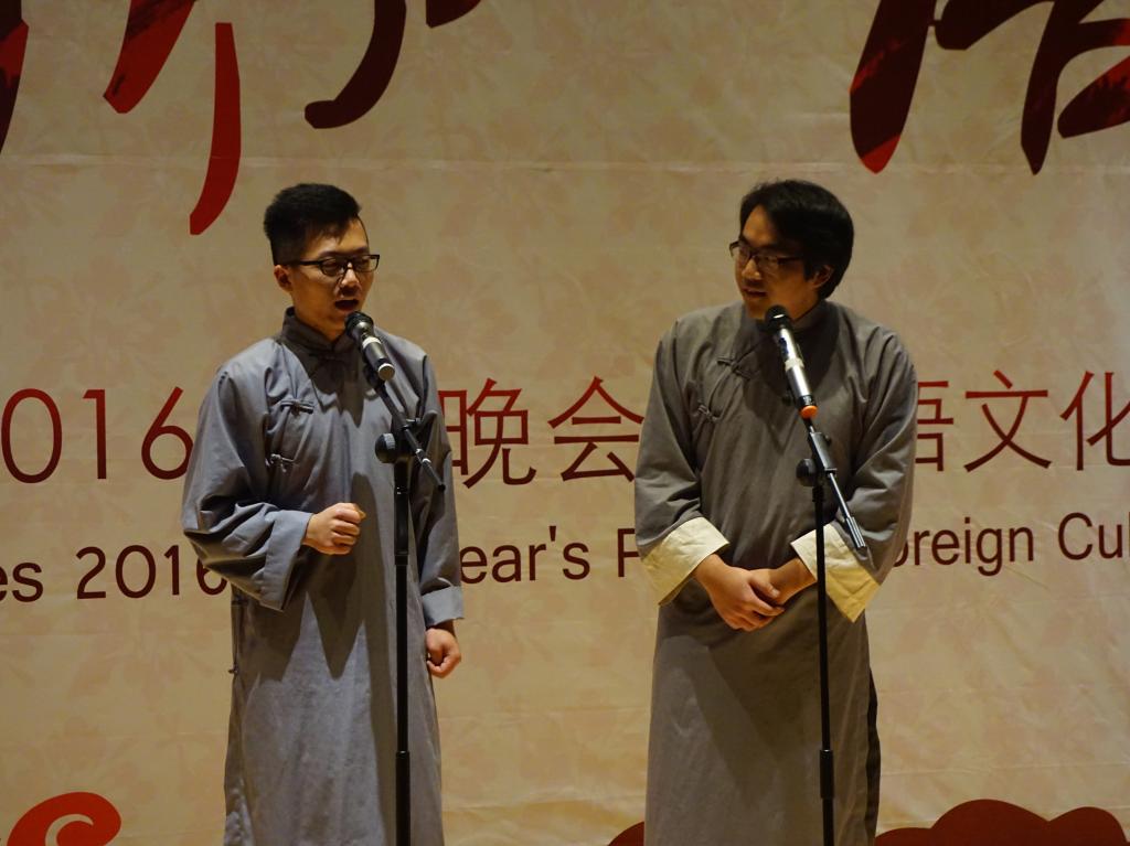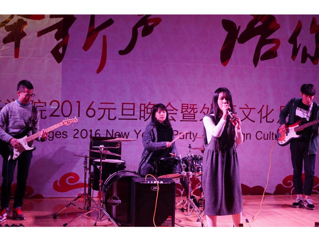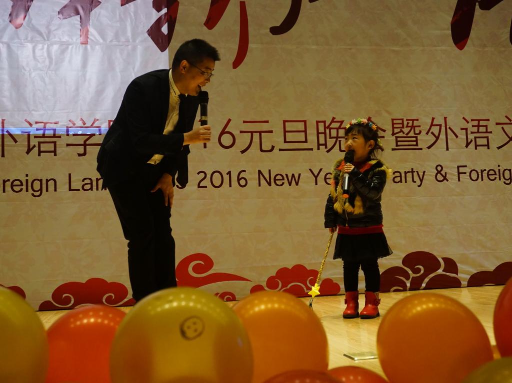 本次晚会采用中、英、法三语主持的形式,诠释出外语学院的文化特色。一段视频回顾了2015年外语学院学生工作的点点滴滴,之后外语学院院长戴运财教授上台致辞,他首先对各位嘉宾的到来表示热烈欢迎,同时对学院2015年的各项工作表示肯定。紧接着,舞蹈《和平的呼唤》反应出战争的残酷并唤起人们对和平的向往;学院老师们带来的圣诞歌曲串烧和自家萌宝稚气的舞蹈逗得全场捧腹大笑;配音大赛获奖节目《冰雪奇缘》、双簧表演《小杨说事》引得台下观众不停叫好;法语歌曲合唱《La famille》给观众奉上一场美妙的声音盛宴;玄妙入神的魔术带领大家进入奇妙的世界;英文戏剧大赛亚军团队的传神表演引得全场啧啧称赞;跆协带来的高难度动作看得大家热血沸腾心潮澎湃。更值得一提的是,由外语学院教师团队带来火辣狂热的现代舞表演点燃全场观众的激情。作为最年轻最受欢迎的教师团队,他们完美地展现出外语学院教师蓬勃的活力,赢得了全场同学的连连尖叫与呐喊。节目间隙,学院领导及大赛赞助商分别对英语读报大赛、英法听写大赛、翻译大赛、学习型口译大赛、英法美文朗诵大赛获奖者进行颁奖。在相声《满腹经纶》和舞蹈表演《万花谷》之后,本次晚会在《We are young》的合唱声中圆满落幕。